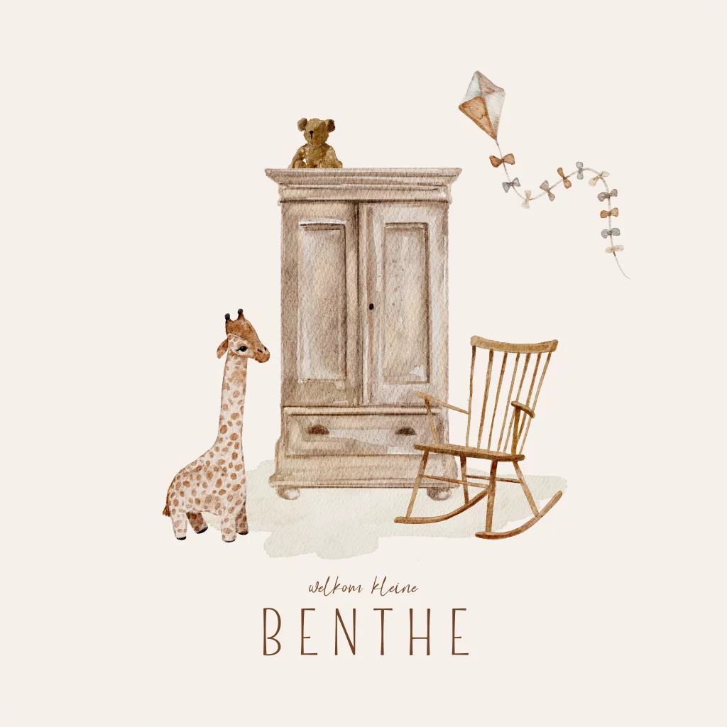 Een vierkant geboortekaartje met handgetekende kinderkamer elementen in mooie zachte neutrale tinten. Op het kaartje voor een meisje staat een kast met een beer, een fijne schommelstoel en naast de kast staat een giraffe. De vlieger maakt het kaartje helemaal af.