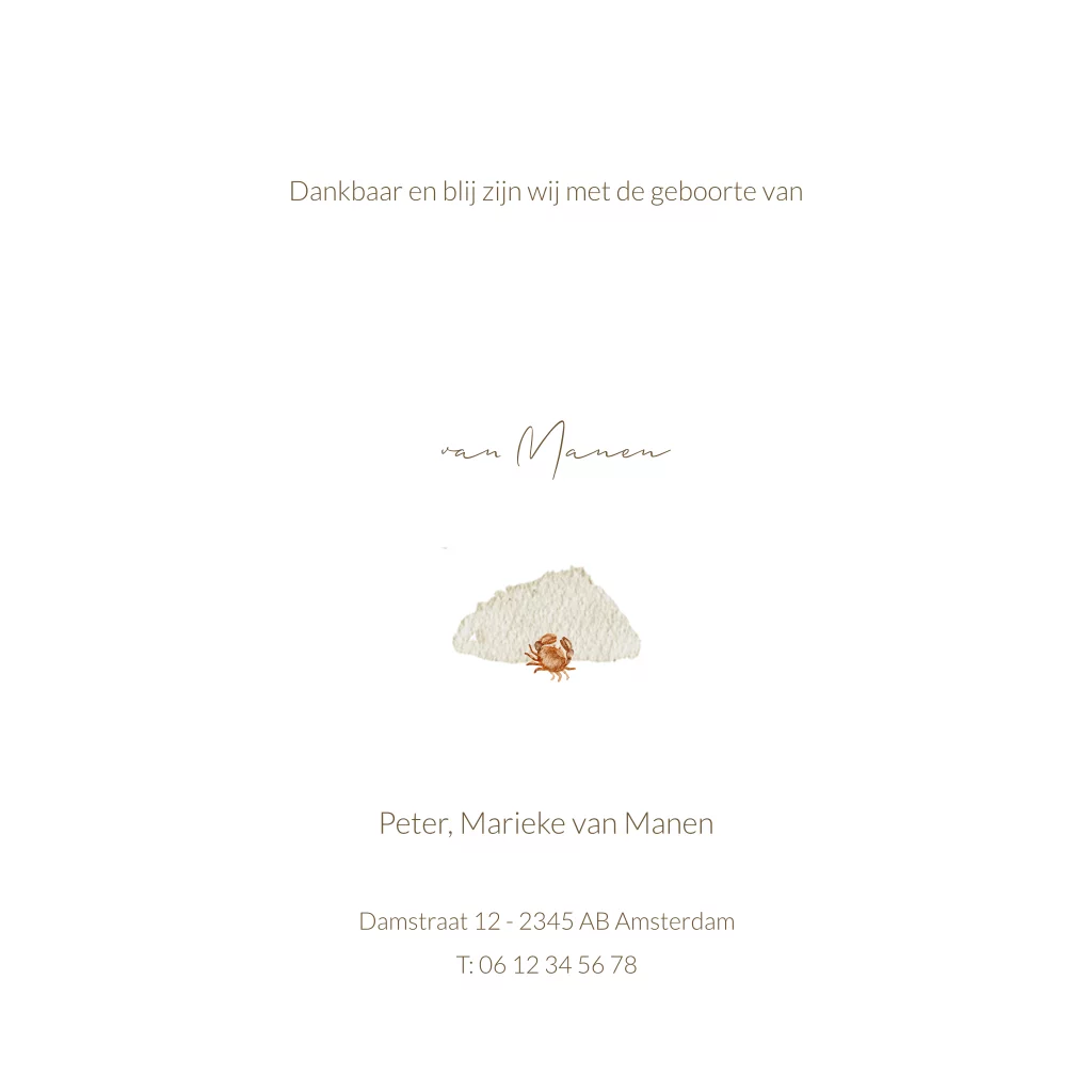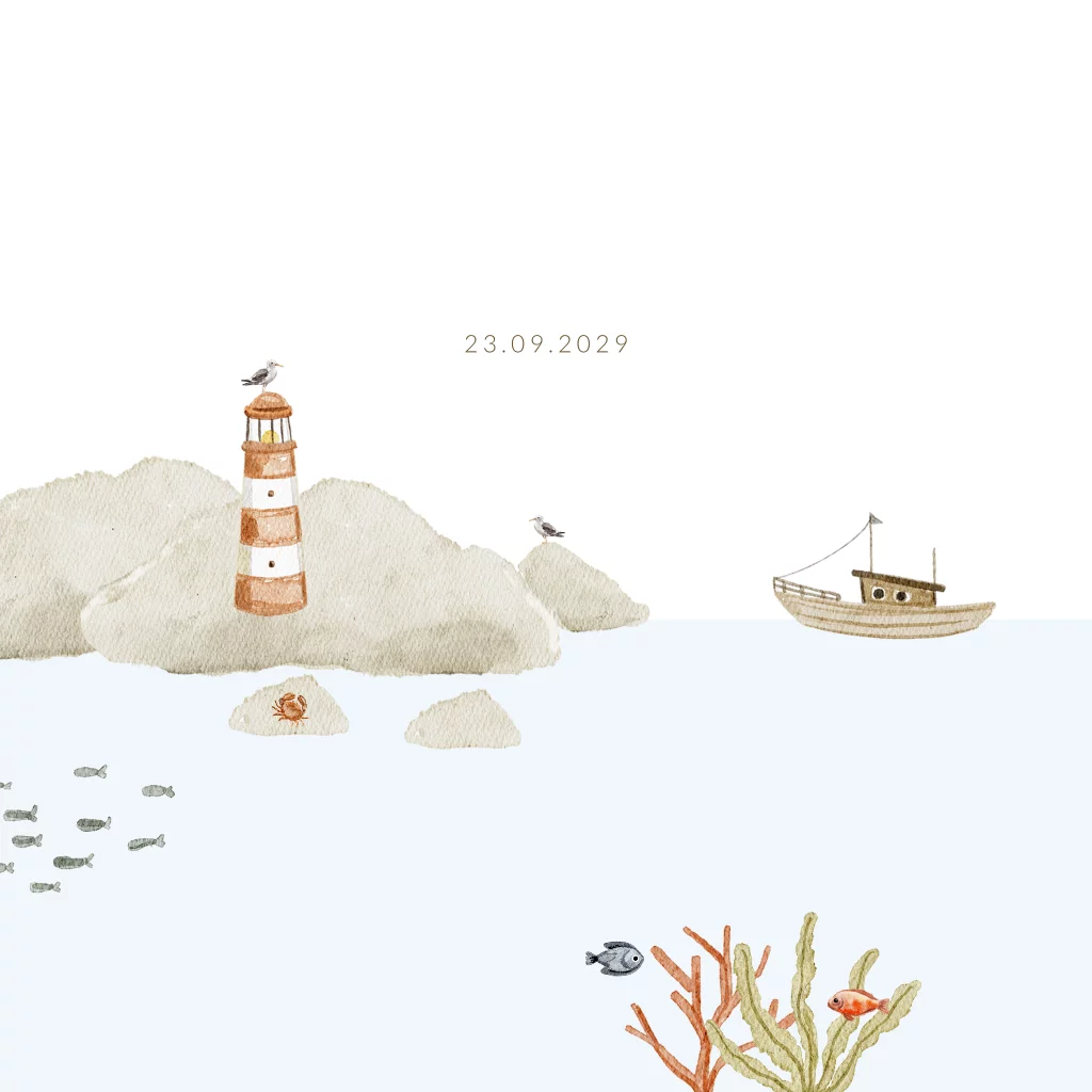 Dit stijlvolle geboortekaartje straalt zomer en warmte uit, met speelse illustraties van waterdieren zoals visjes, schelpen en een krab. De toevoeging van goudfolie geeft het ontwerp een luxe en sprankelende uitstraling, perfect voor een bijzonder moment.