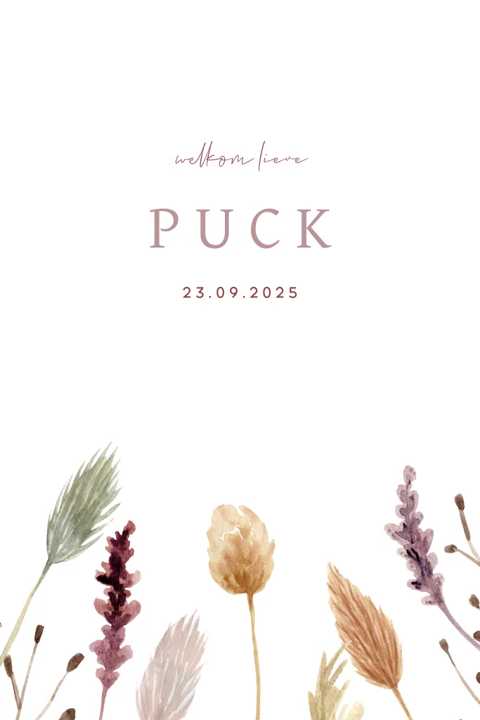 Lief enkel geboortekaartje met droogbloemen. Het kaartje heeft ronde hoeken en illustraties van roze en oranje droogbloemen. Je kunt dit babykaartje zelf bewerken en aanpassen.
