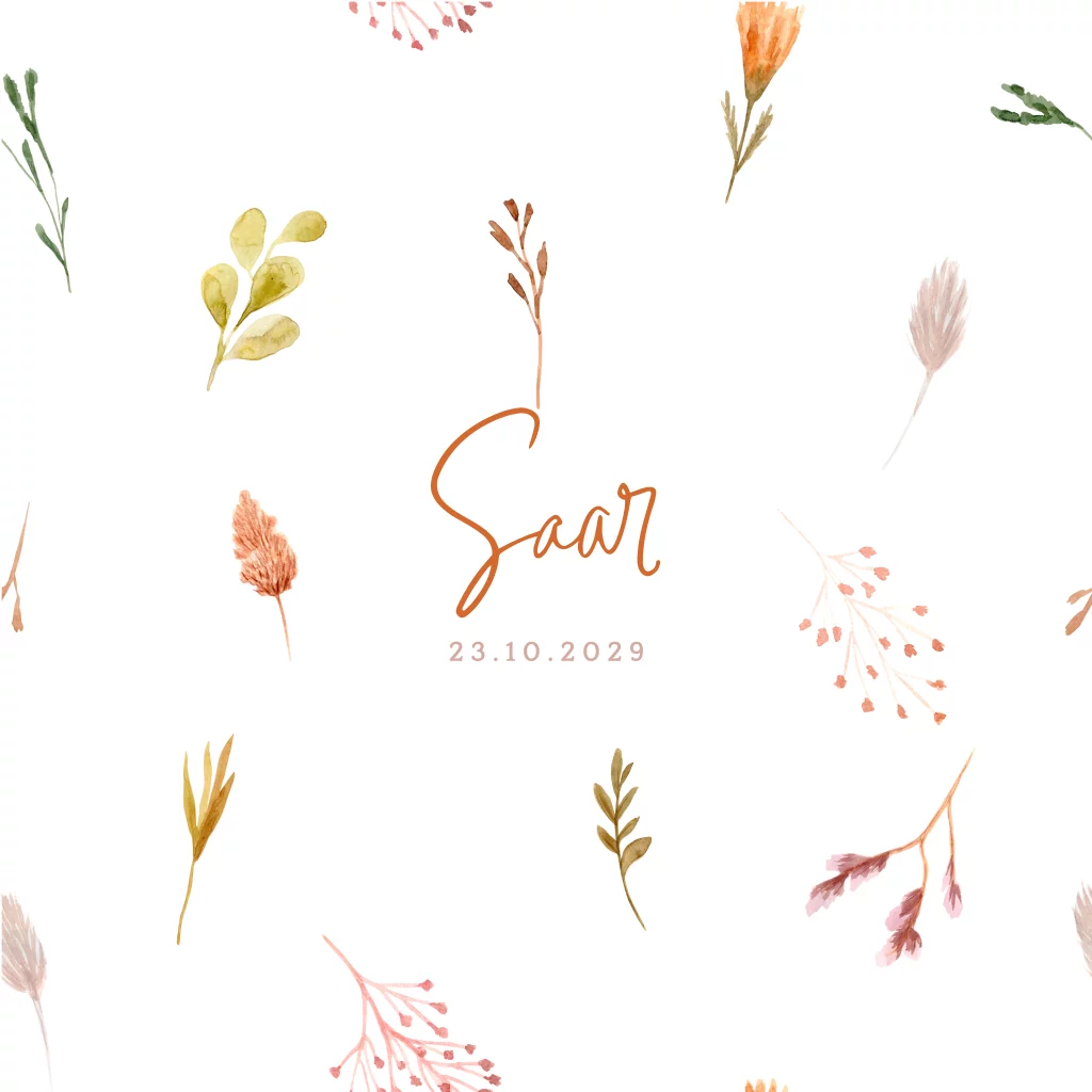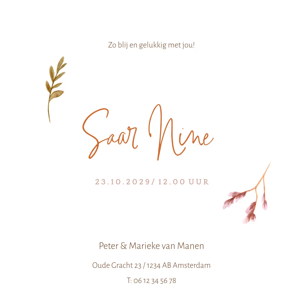 Populair geboortekaartje met roze en oranje droogbloemen. De takjes staan verspreid over het kaartje heen en in het midden kan je de naam plaatsen. Maak dit kaartje helemaal naar wens in onze editor.