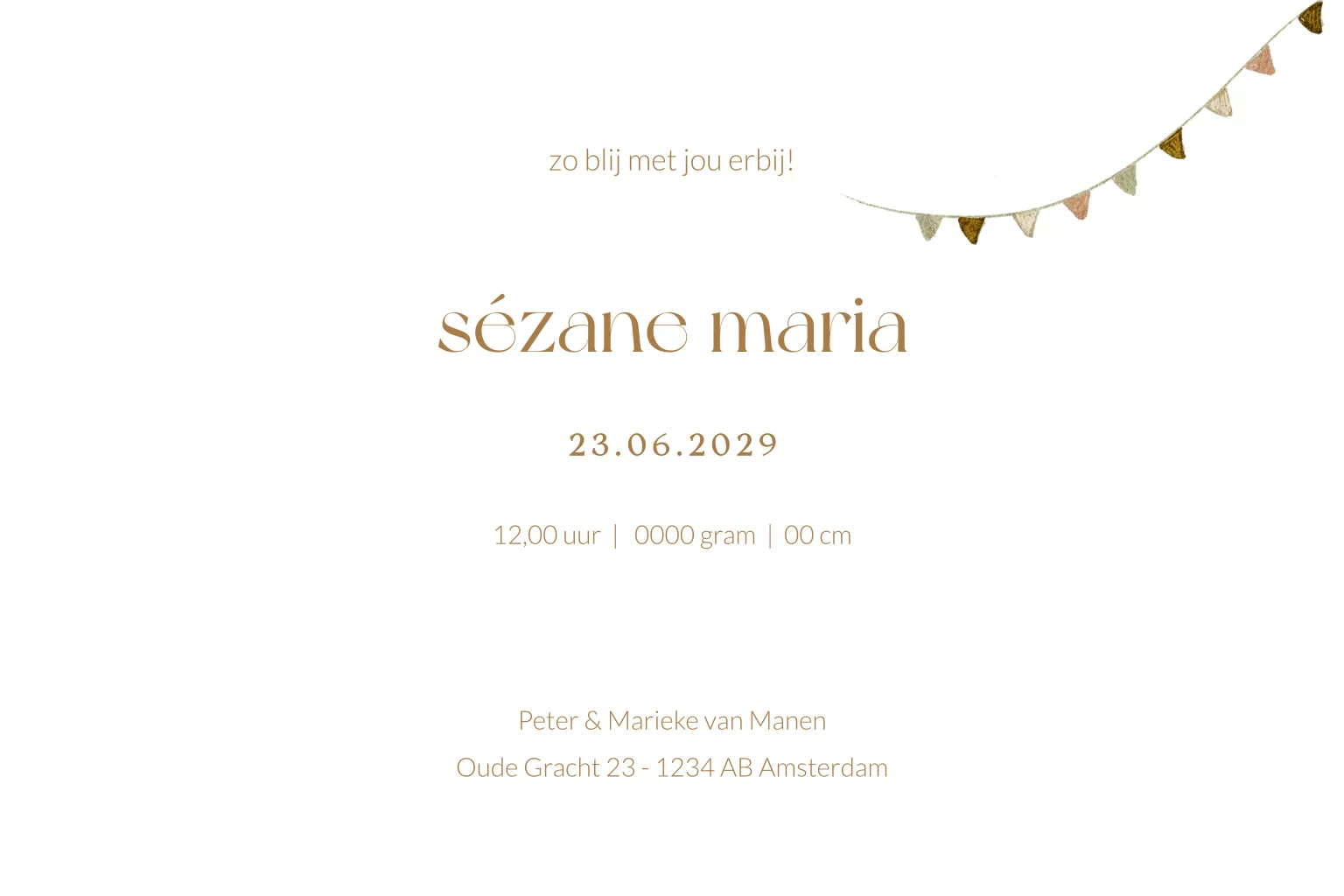Vier de geboorte van je kleintje met een geboortekaart vol schattige bosdieren! Denk aan een vrolijke beer en een speelse eekhoorn, omringd door feestelijke vlaggen. Perfect om de komst van je baby op een unieke en feestelijke manier aan te kondigen. Alle illustraties kan je zelf aanpassen op het kaartje in onze handige online editor. De naam wordt gedrukt in hoogglans, waardoor het een extra luxe kaartje wordt.