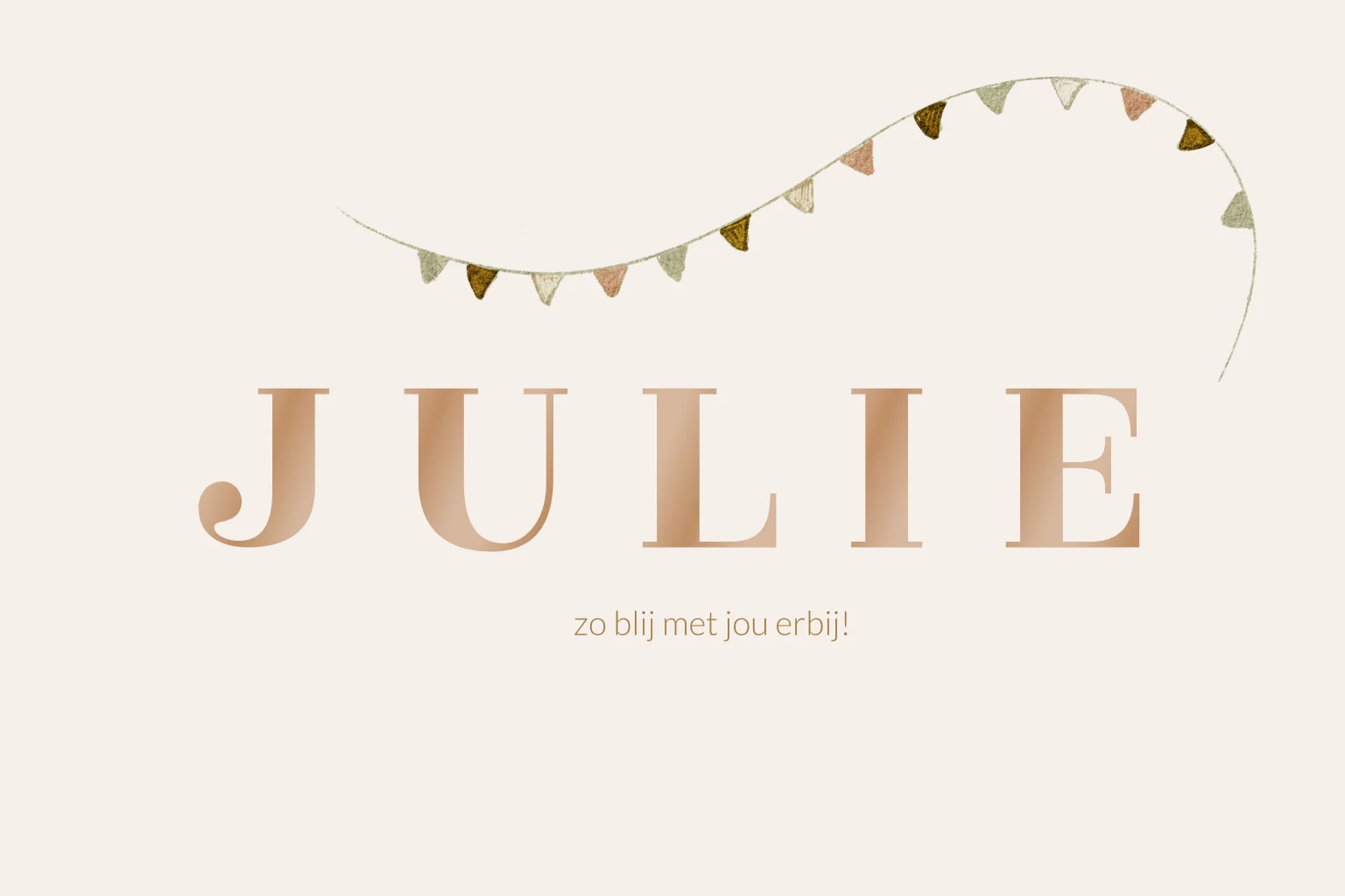 Bekijk dit prachtige hoogglans geboortekaartje. De naam wordt gedrukt in hoogglans folie wat het kaartje een extra chique uitstraling geeft. Boven de naam staan getekende vlaggetjes voor extra vrolijkheid. Unisex kaartje, voor jongens én meisjes.