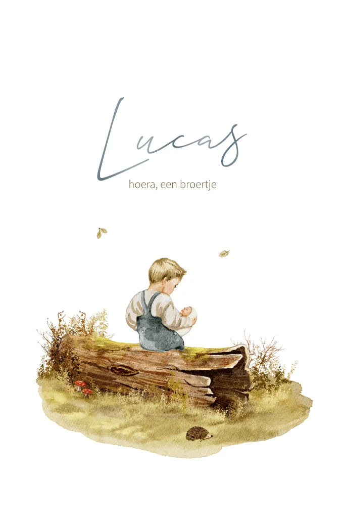 Het geboortekaartje van jouw kleintje moet iets bijzonders zijn. Bij Fientje en Co bieden we jou de kans om een geboortekaartje met unieke illustraties te creëren, helemaal afgestemd op jullie stijl. Dit kaartje met een schattige illustratie van een grote broer met baby op een boomstronk is met zorg ontworpen en met de hand geschilderd in waterverf, wat het een warme, persoonlijke uitstraling geeft. De naam wordt gedrukt in hoogglans oudblauw, wat een mooie combinatie is bij de tekening.