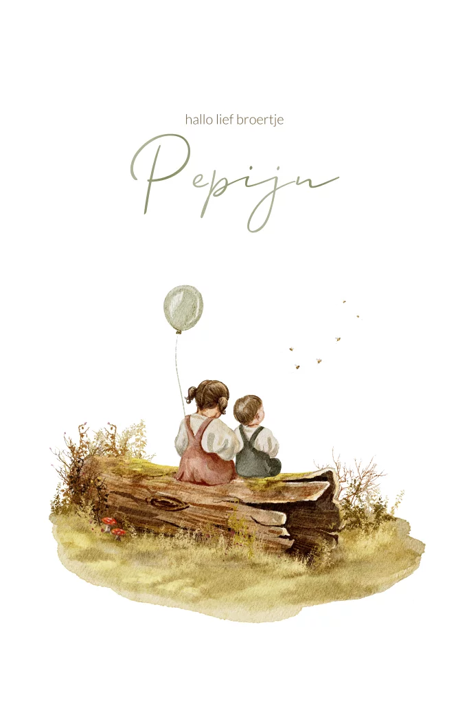 Het geboortekaartje van jouw kleintje moet iets bijzonders zijn. Bij Fientje en Co bieden we jou de kans om een geboortekaartje met unieke illustraties te creëren, helemaal afgestemd op jullie stijl. Dit kaartje met een schattige illustratie van een grote zus met broertje op een boomstronk is met zorg ontworpen en met de hand geschilderd in waterverf, wat het een warme, persoonlijke uitstraling geeft. De naam wordt gedrukt in hoogglans groen, wat een mooie combinatie is bij de tekening. De illustraties van de kindjes kan je zelf aanpassen.