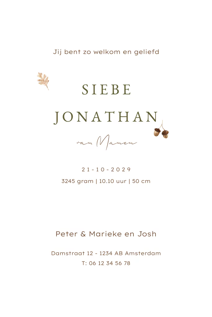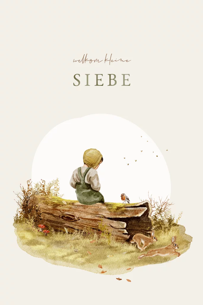 Welkom bij onze collectie unieke geboortekaartjes! Dit prachtig getekende geboortekaartje is perfect voor de geboorte van een jongen. De illustratie van een jongen op een boomstam, omringd door rennende hazen, straalt een warme en natuurlijke sfeer uit. Met dit kaartje kun je zelf spelen en het helemaal aanpassen naar jouw wensen, zodat het perfect past bij de aankondiging van jullie nieuwe gezinslid. De aquarel-achtige stijl, in combinatie met de warme kleuren beige en bruin, zorgt voor een rustige en luxe uitstraling. Het toegevoegde groene hoogglans voor de naam geeft het kaartje een extra vleugje elegantie.