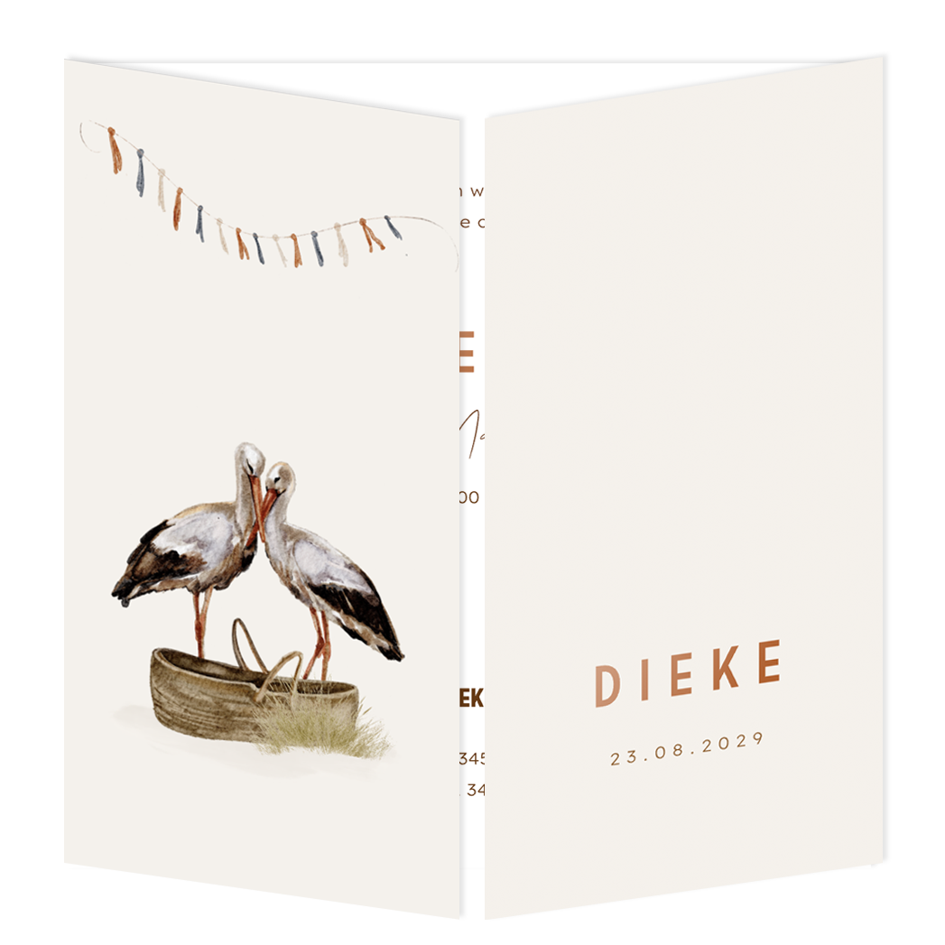 Een schattig getekend geboortekaartje voor een meisje. Dit kaartje is een tweeluik, en heeft aan de voorkant twee luikjes die je kunt openen. Op het ene luikje staat een illustratie van ooievaars bij een mandje, en op het andere luikje de naam van jullie kindje in hoogglans. Je kunt dit kaartje zelf personaliseren in onze handige editor.