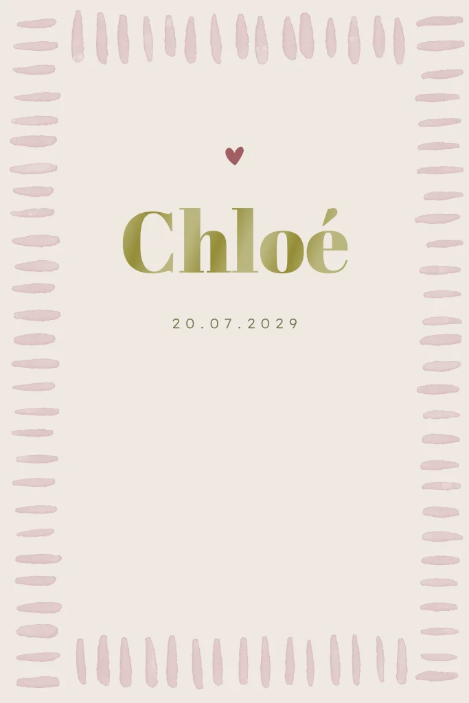 Ben je op zoek naar een lief en trendy geboortekaartje? Dit unieke geboortekaartje combineert zachte roze getekende strepen met een opvallende groene naam in hoogglans. Het eigentijdse ontwerp geeft een frisse en moderne uitstraling, terwijl de glanzende naam zorgt voor een luxe en persoonlijk accent.