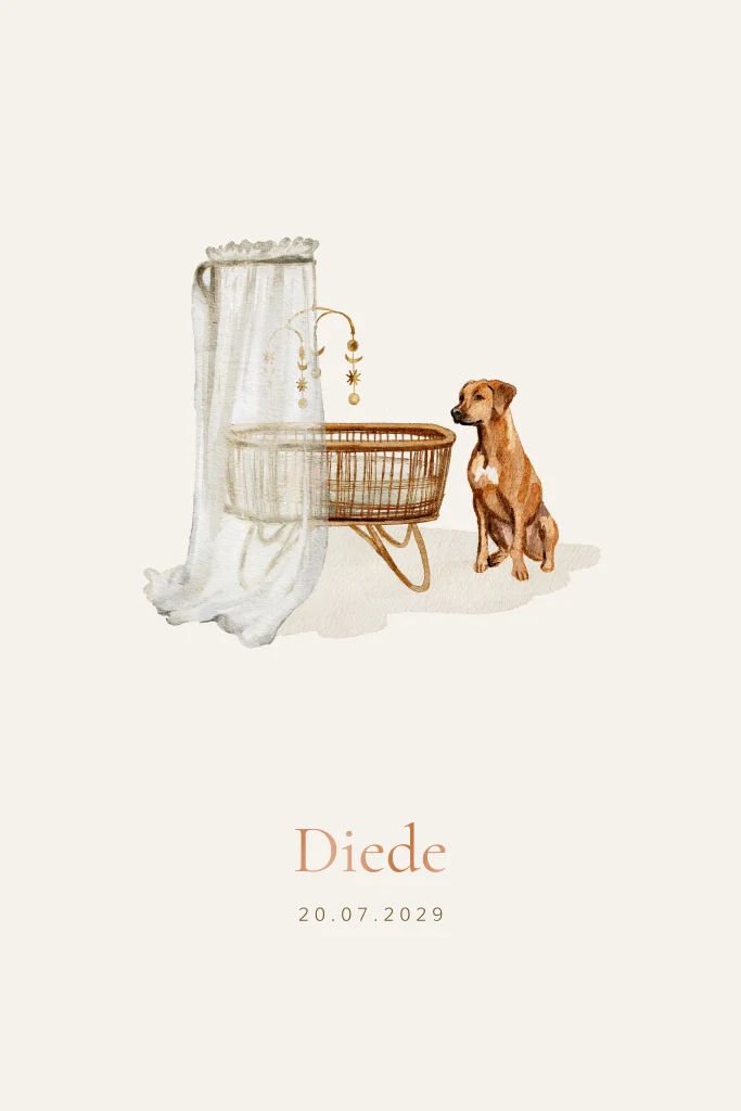 Krijgen jullie een eerste kindje en hebben jullie een rhodesian ridgeback? Dan is dit getekende geboortekaartje echt wat voor jullie! De hond is naast een wiegje getekend. De naam wordt gedrukt in hoogglans. Dit babykaartje kan je zelf helemaal naar wens bewerken. Je kunt ook je eigen hond laten natekenen door ons voor een extra persoonlijk en uniek kaartje! Of vervang de hond door eentje uit onze beeldbank.