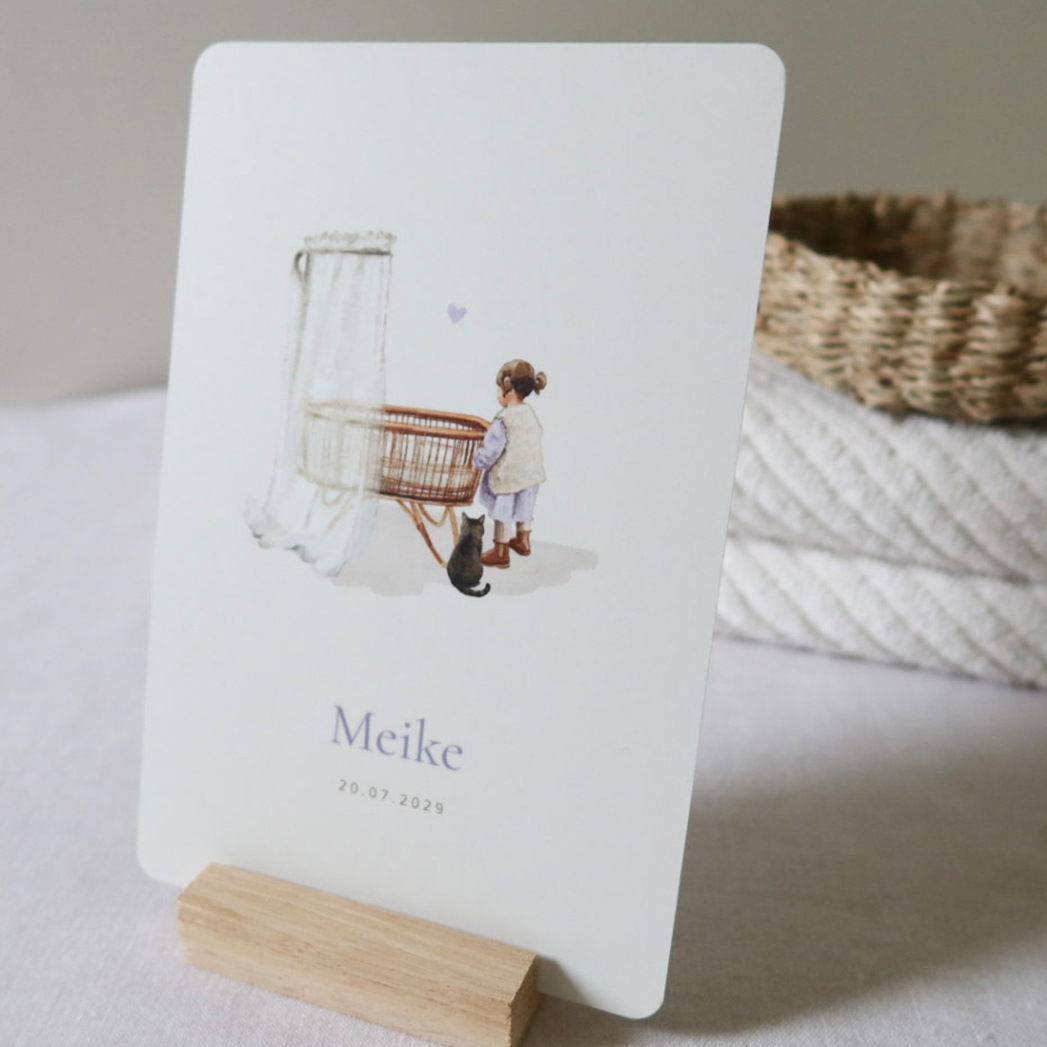 Krijgen jullie een tweede kindje en hebben jullie een grijze kat? Dan is dit getekende geboortekaartje echt wat voor jullie! De kat is naast een wiegje getekend en hierbij staat een ouder zusje. Dit babykaartje kan je zelf helemaal naar wens bewerken. Je kunt ook je eigen hond laten natekenen door ons voor een extra persoonlijk en uniek kaartje! Of vervang de hond en het meisje door een andere illustratie uit onze beeldbank.