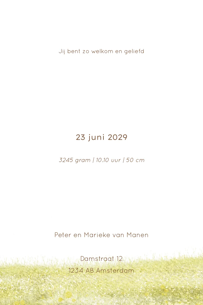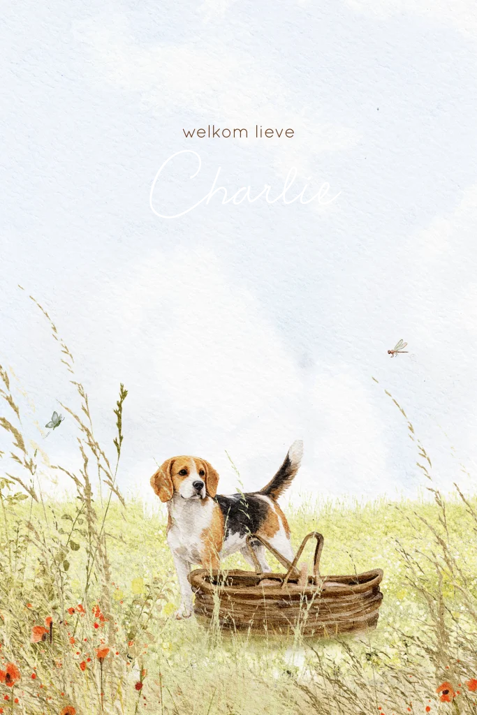 Prachtig getekend geboortekaartje voor de zomer. De achtergrond heeft een blauwe lucht en in het gras staat een baby in een mandje. Daarbij staat een beagle. Je kunt zelf kindjes toevoegen of een ander huisdier kiezen uit de illustratie map.