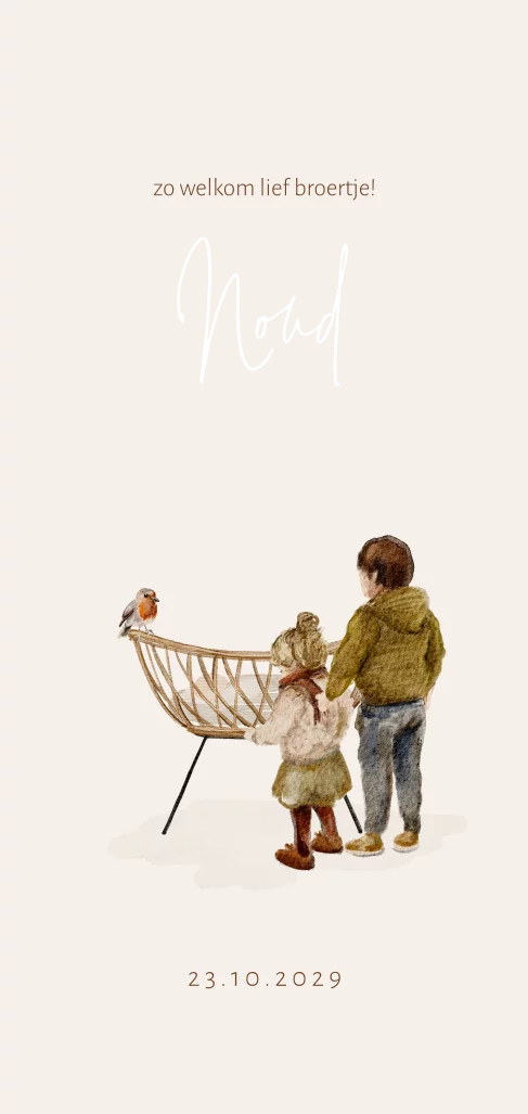 Getekend geboortekaartje met een gezin. Bij het wiegje met een baby staat een ouder zusje en broer. Op het wiegje zit een roodborstje en de kindjes hebben ook jasjes aan. Dit maakt dit babykaartje heel geschikt voor een herfst of winter baby. Je kunt de kindjes ook vervangen als jullie gezin een andere samenstelling heeft, of vraag ons even om hulp.