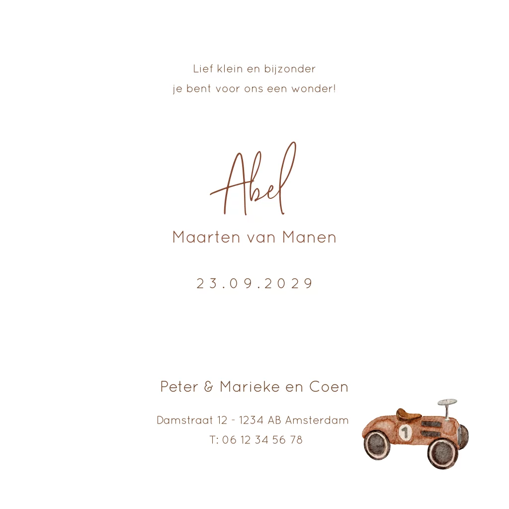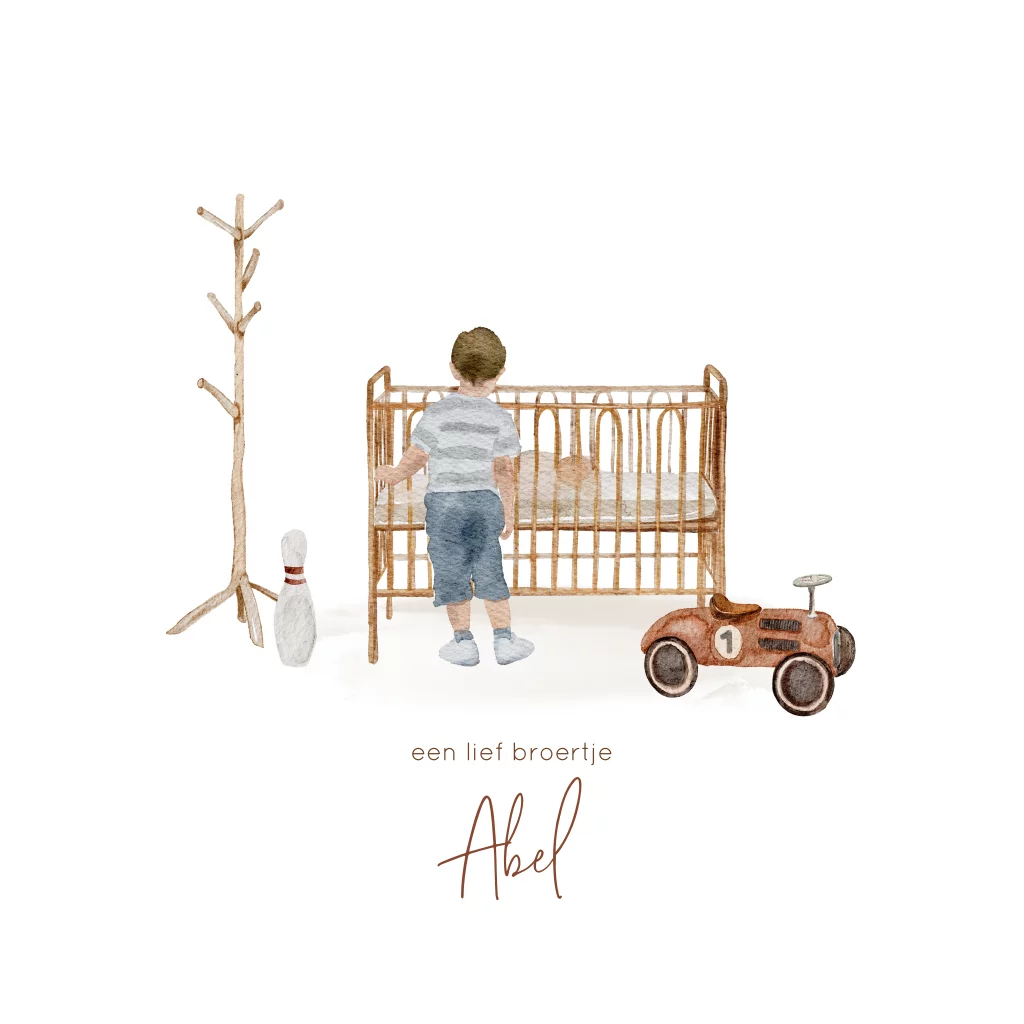Wat een lief geboorte kaartje voor een broertje is dit! De grote broer kijkt in een ledikantje naar het baby broertje en daarom heen staat speelgoed. Je kunt dit babykaartje voor een tweede kind helemaal zelf bewerken en aanpassen.