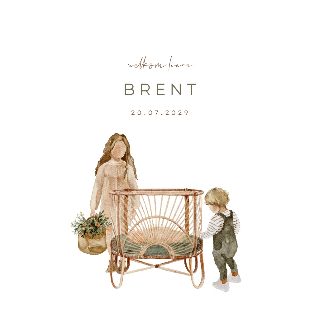 Lief geboortekaartje voor een derde kindje. Op het kaartje staan getekende illustraties van een grote zus en broertje bij een wiegje. Je kunt dit kaartje zelf helemaal aanpassen.