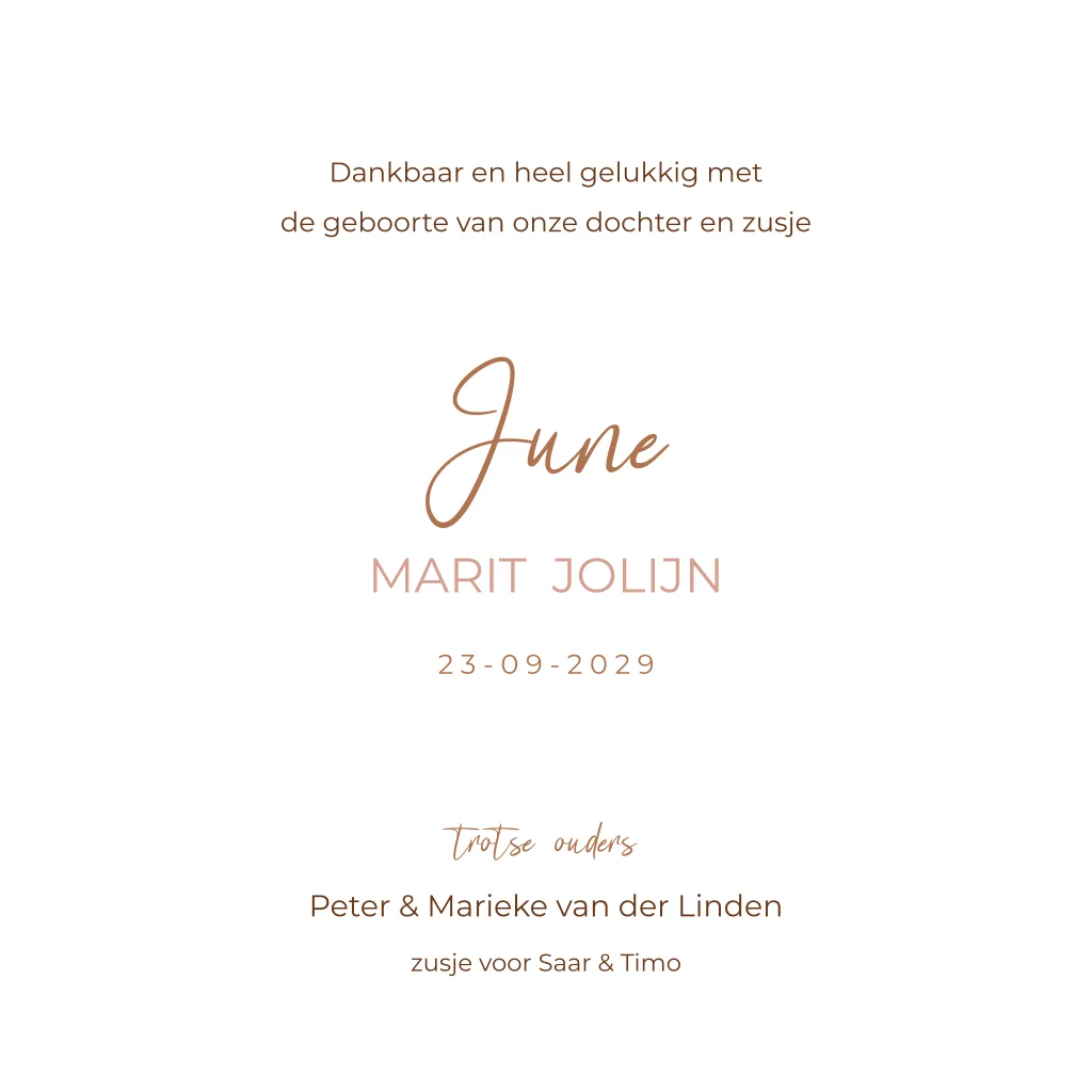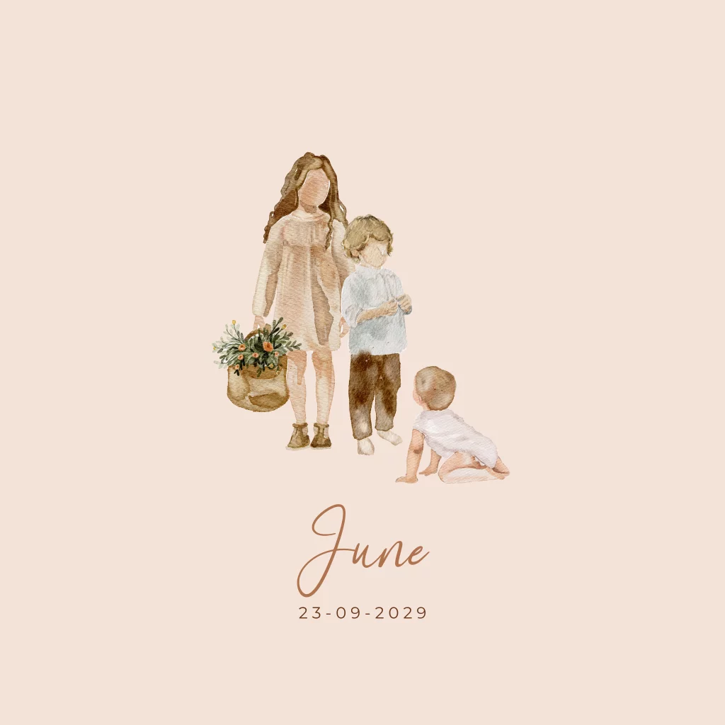 Deze geboortekaart is zo lief voor een derde kindje. De achtergrond van het kaartje is roze en daarop staan getekende illustraties. De grote zus heeft een mandje bloemen en het broertje kijkt naar het baby meisje op de grond. Dit kaartje kan je zelf aanpassen in onze editor en aanvullen met andere illustraties in dit thema.