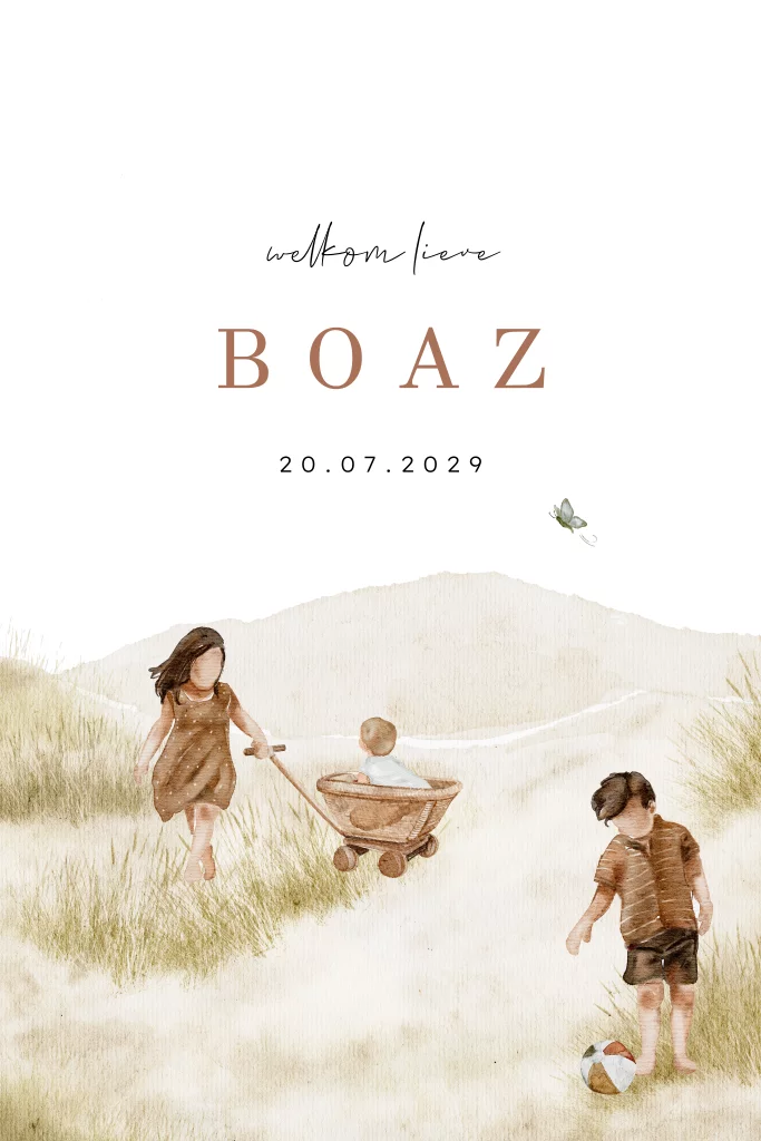 Origineel zomer geboortekaartje voor een broertje. De achtergrond zijn duinen en in het zand lopen kindjes met een broertje in een strandkar. Lief geboortekaartje voor een derde kindje. Je kunt dit kaartje ook vervangen door andere kindjes of illustraties.