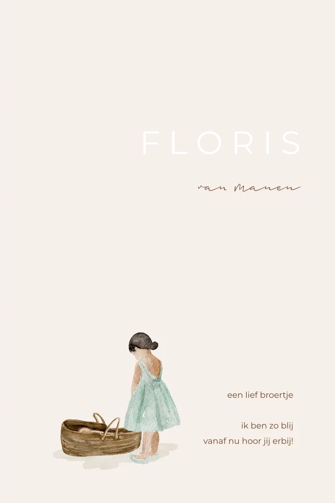 Origineel getekend geboortekaartje met voor een broertje. Op het kaartje staat een oudere zus bij een bay in een mandje. Je kunt zelf kindjes aanpassen en passend maken bij jullie gezin. De naam wordt gedrukt in goudfolie. Prachtig en uniek babykaartje voor een zoon.