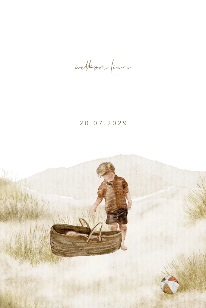 Geboortekaartje voor een broertje in een zomer thema. Op de achtergrond van dit babykaartje staan duinen en gras en in het midden staat een mandje met een baby. Daarnaast staat een grote broer. Je kunt de illustraties op dit kaartje zelf vervangen door andere kinderen. De naam is gedrukt in goudfolie.