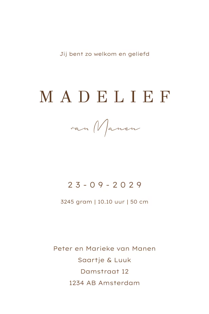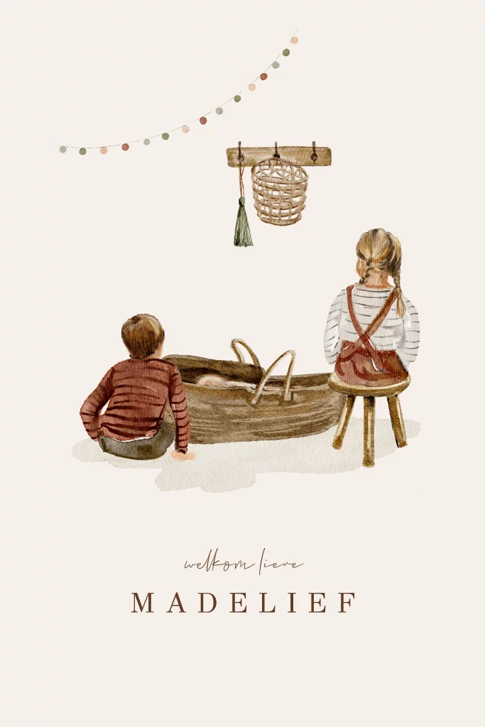 Origineel getekend geboortekaartje met een baby in mandje en een grote zus op een krukje. Aan de andere kant zit een broer op de grond. Bovenaan hangen vrolijke slingers. Mooi kaartje voor een derde kindje eventueel met folie. Het meisje kan je ook vervangen door een jongetje. Alle illustraties vind je in de beeldbank, zo kan je zelf deze kaart aanpassen naar jullie gezinssamenstelling.