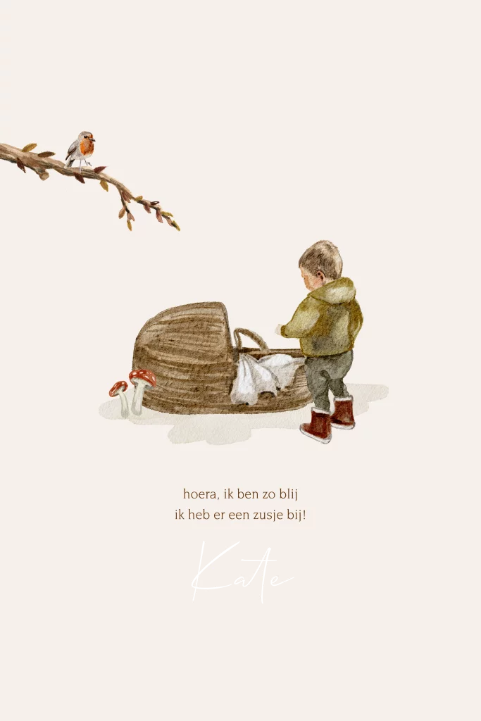 Krijgen jullie een herfst baby, dan is dit getekende geboortekaartje voor een zusje misschien iets voor jou! Dit kaartje met ronde hoeken heeft een prachtige illustratie van een baby mandje en daarbij een ouder broertje. Op de tak zit een roodborstje. Je kunt het jongetje ook weg halen als het jullie eerste kindje is.