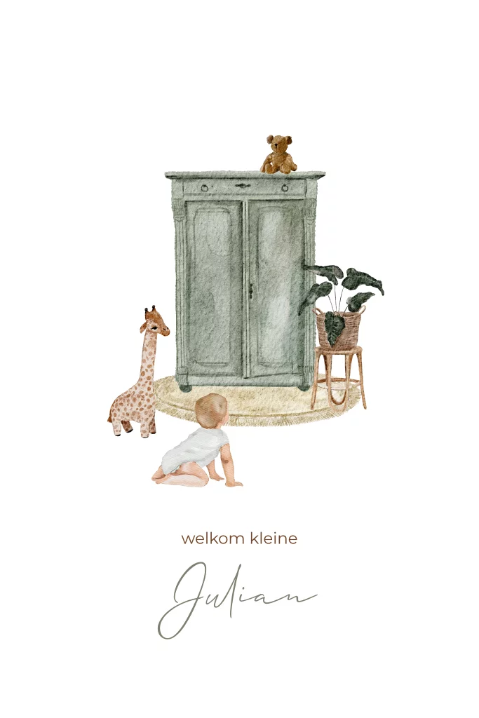 Origineel getekend geboortekaartje met een kinderkamer tafereel. In het midden staat een groene kast en daarop zit een beer. Voor de kast staat een plant en een giraf. De kleine baby kijkt naar de beer op de kast. Dit kaartje voor jullie baby kan je zelf helemaal naar wens aanpassen met onze illustraties.