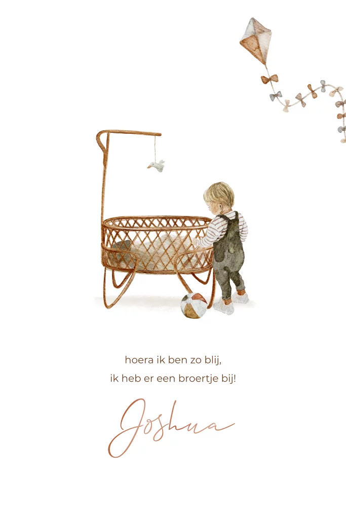Geboortekaartje jongen tweede kind met broer bij een wiegje en vlieger