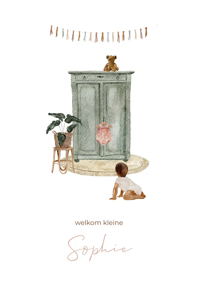 Lief getekend geboortekaartje met illustraties van een baby in een kinderkamer. Het kleine meisje kruipt op de grond en aan de groene kast hangt een roze romper. De slinger bovenaan maakt het baby kaartje extra feestelijk. Alle illustraties staan los op het kaartje en kan je zelf verplaatsen of vervangen.