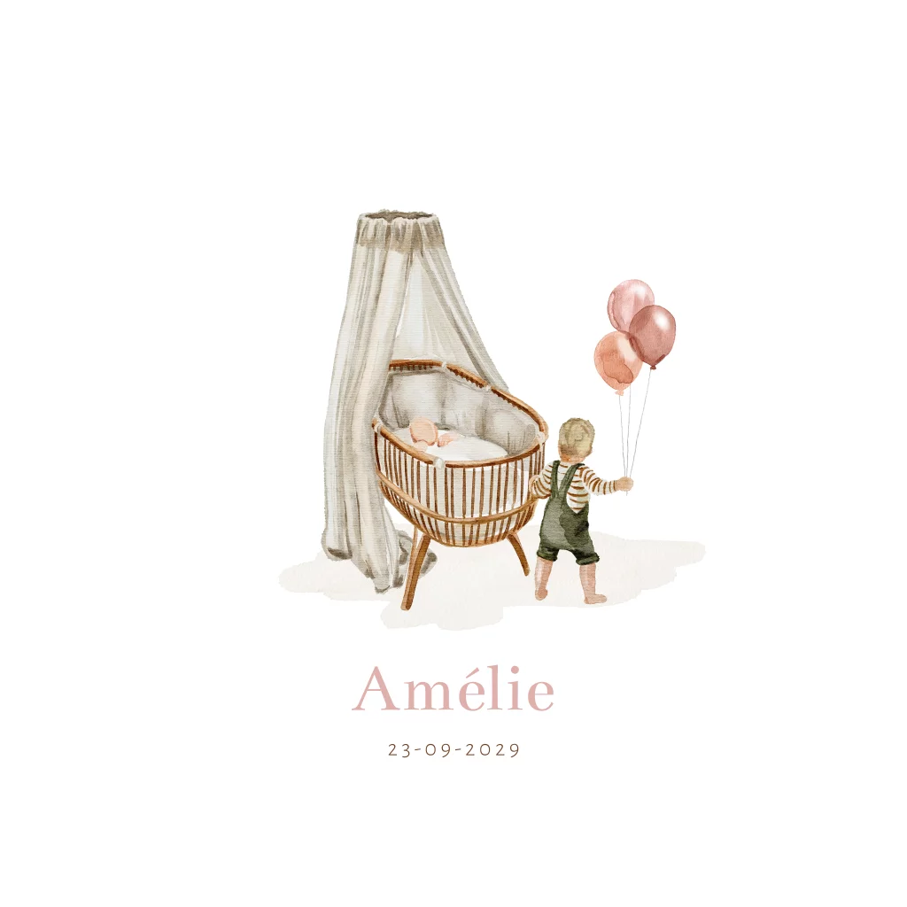 Lief getekend geboortekaartje voor een klein zusje. In de wieg ligt een baby en daarbij staat een broertje met roze ballonnen in zijn hand. Je kunt het jongetje ook vervangen door andere kindjes uit onze beeldbank. Uniek babykaartje met aquarel illustraties.