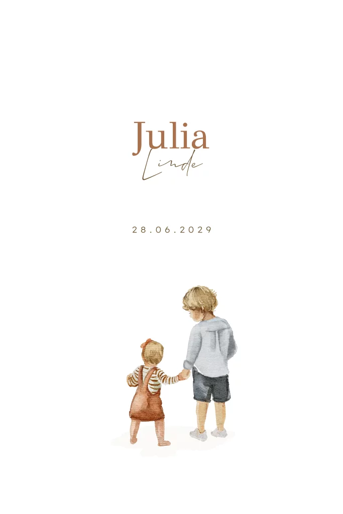 Uniek getekend geboortekaartje voor een tweede kind. Op dit kaartje met ronde hoeken staat een ouder broertje met een baby zusje in zijn hand. De aquarel tekeningen maken dit kaartje zo lief. Bewerk zelf het kaartje voor jullie 2e kindje.
