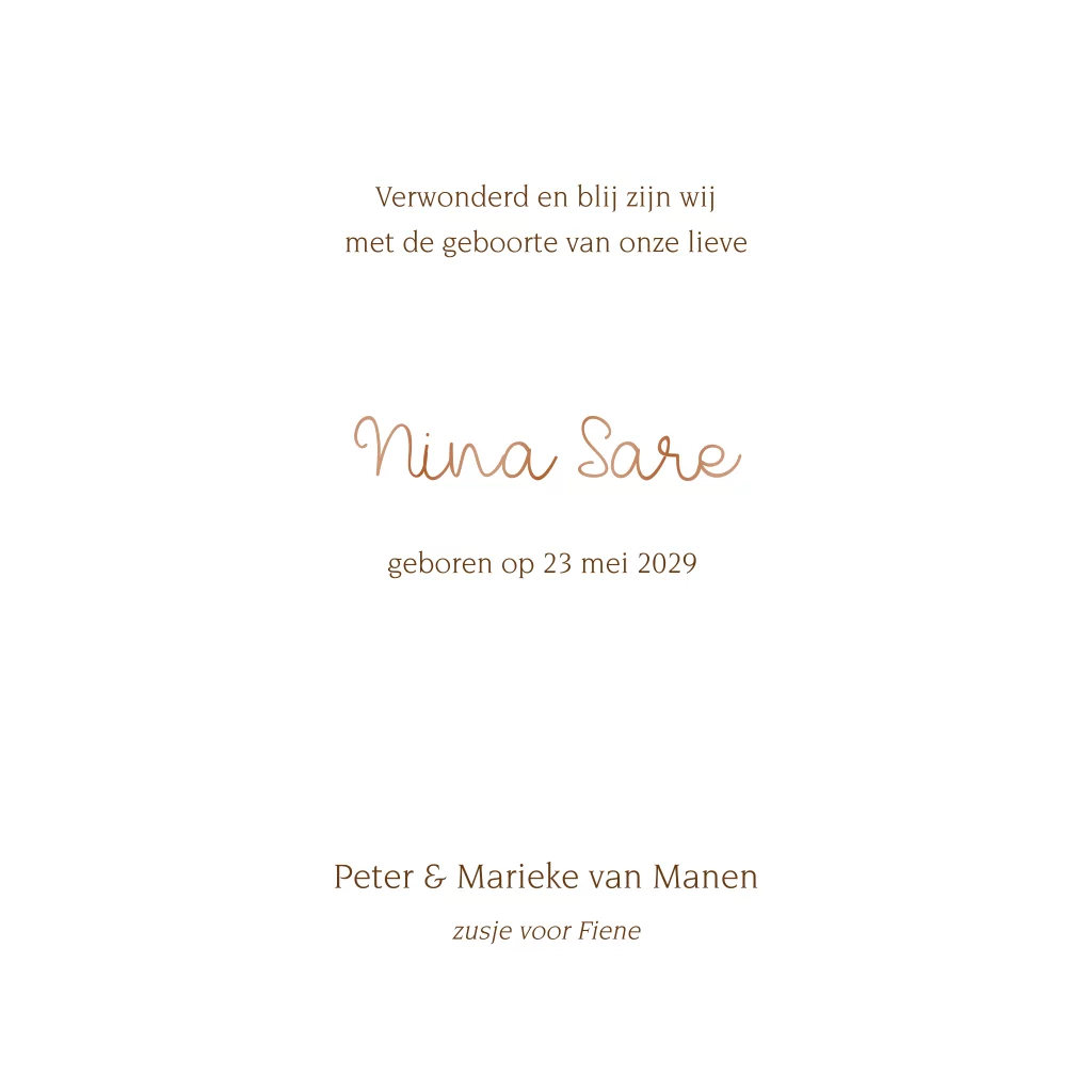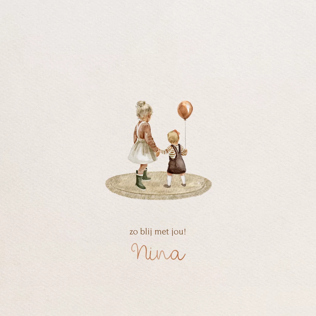 Lief getekend geboortekaartje voor een tweede kind. Op het kaartje staat een grote zus met een baby meisje aan haar hand. De achtergrond heeft een aquarel papier look. Uniek babykaartje met hoogglans wat je zelf kunt aanpassen.