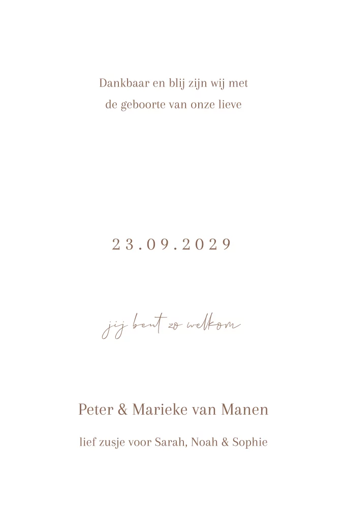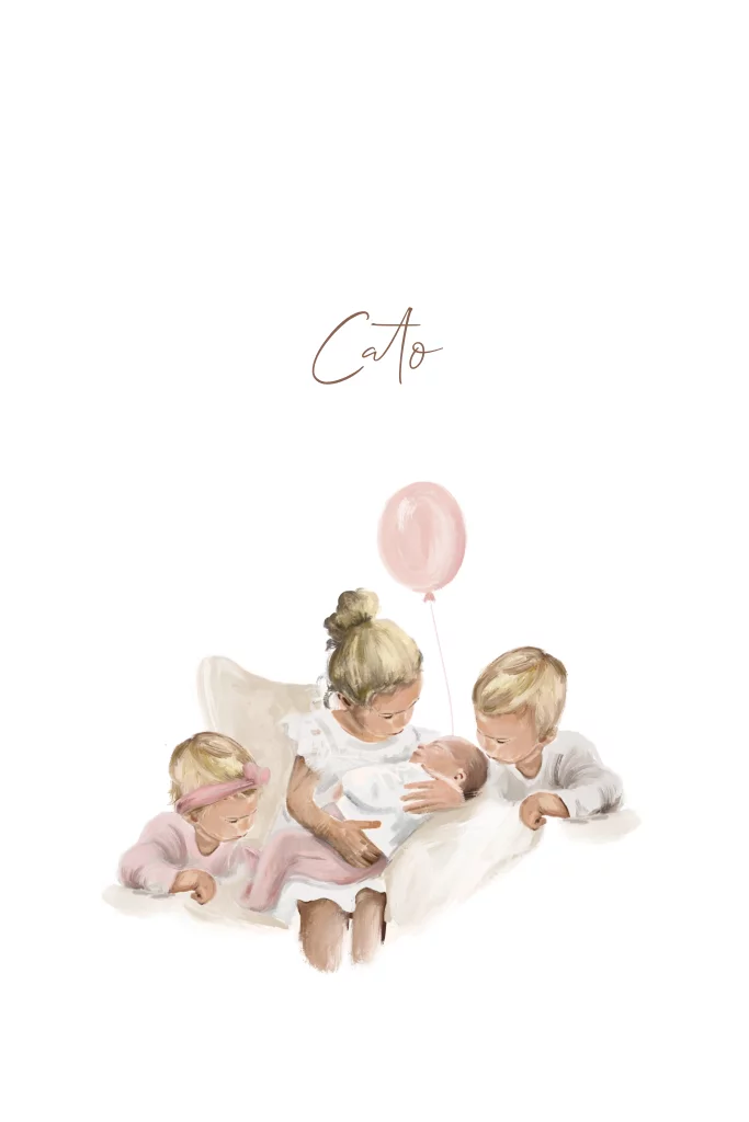 Zoek je een uniek geboortekaartje voor jullie vierde kindje. Dan is dit zeker een optie. Op het kaartje staat een prachtige getekende illustratie van een gezin met een zus, broer, zusje en een baby. We kunnen ook andere gezinssamenstellingen maken. De roze ballon maakt het kaartje extra feestelijk. Bewerk het met eigen teksten en bestel een proefkaartje.