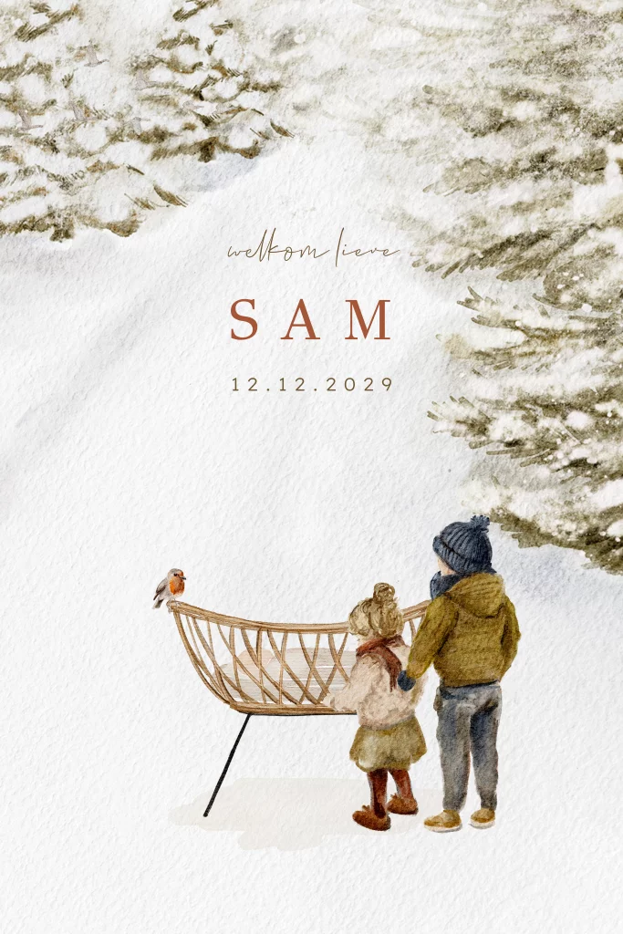 Geboortekaartje winter voor derde kindje met wieg en kindjes