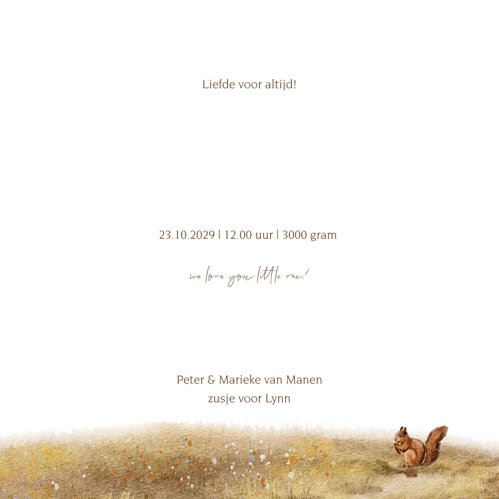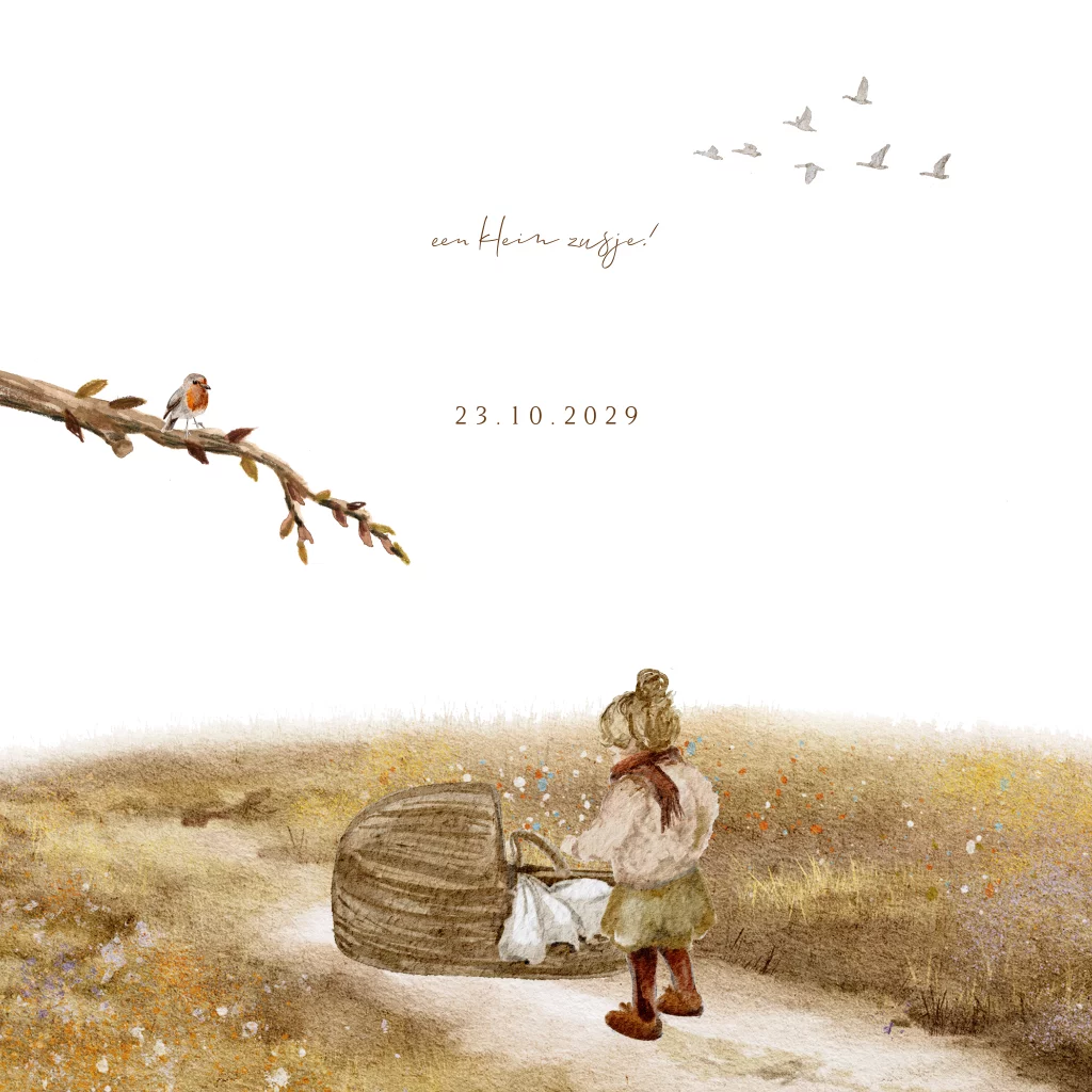 Uniek getekend geboortekaartje voor een zusje. Dit herfst kaartje heeft een achtergrond van een bos pad met daarop een baby mandje en een zusje die in de mand kijkt. Op een tak zit een roodborstje. Dit babykaartje met goudfolie en ronde hoeken kan je ook gebruiken voor een jongen.