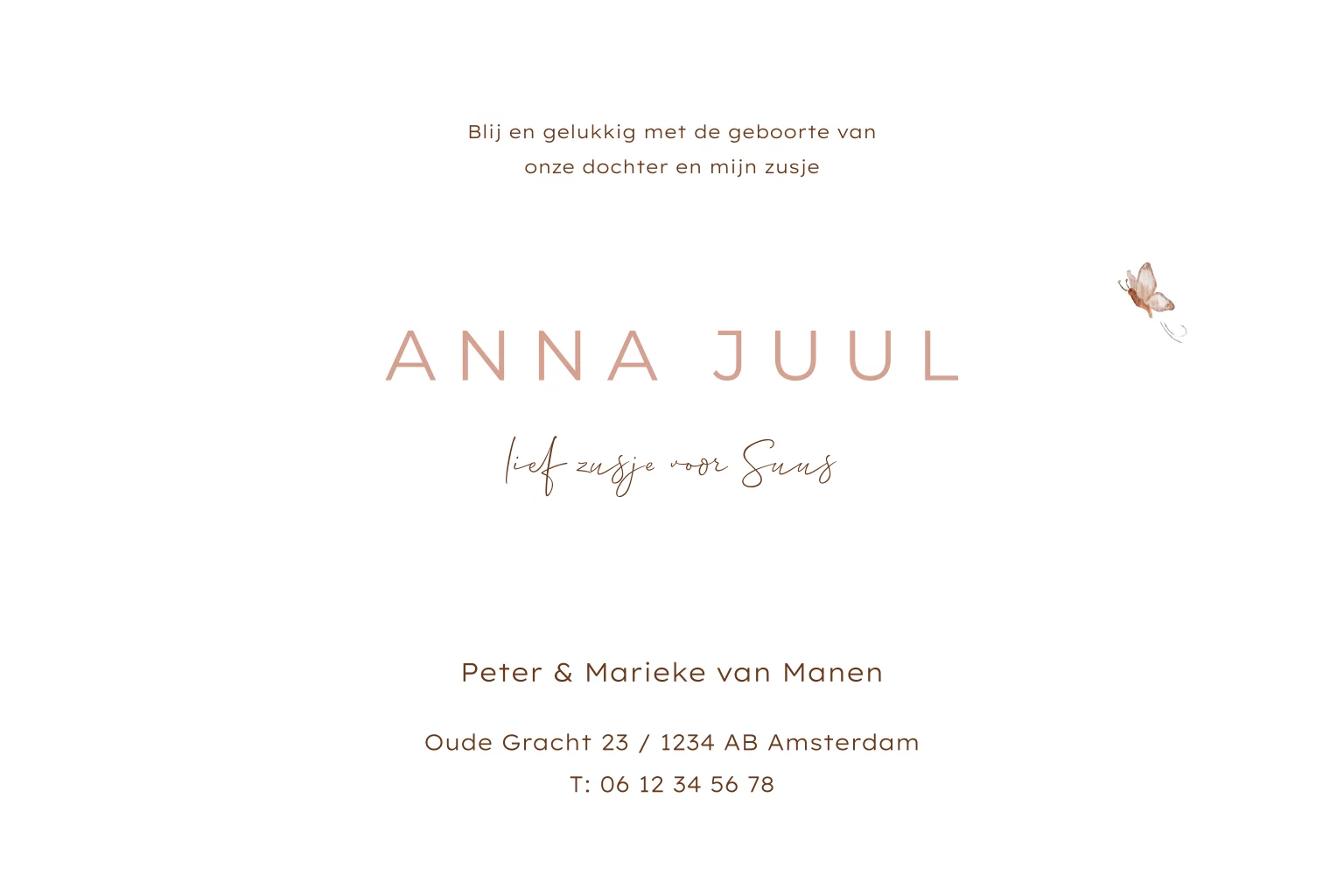 Lief geboortekaartje voor een zusje. Op het kaartje staat een illustratie van een oudere zus bij bij een kar met een baby er in. In de lucht vliegt een roze vlindertje.