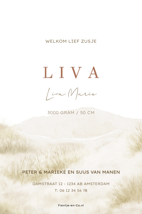 Lief geboortekaartje voor een zusje in een zomer thema. Op de achtergrond staan duinen met helmgras en in het midden staat een grote zus bij een zusje in het zand. En de kindjes op deze kaart kan je vervangen als jullie oudste een jongetje is. Naam is in koper hoogglans, maar kan ook in andere kleuren.