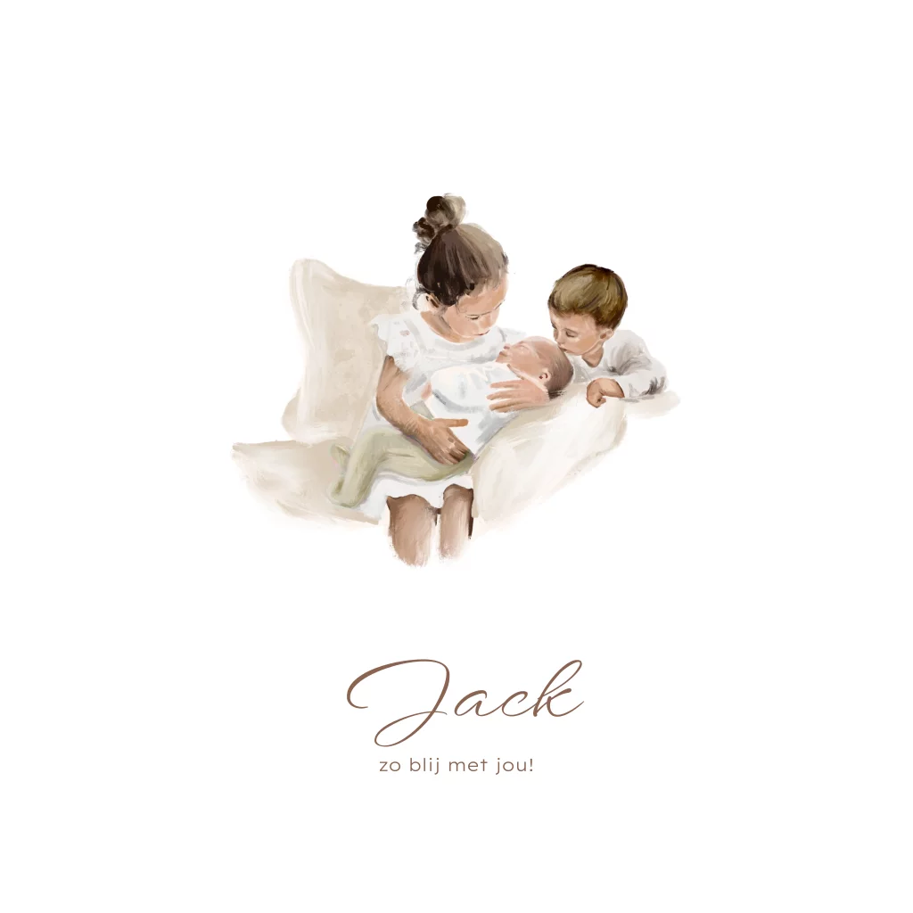 Wil je een uniek geboortekaartje, kies dan voor een geschilderd geboortekaartje van jullie gezin. Op het kaartje staat een zus met een baby op haar schoot en daarbij een jonger broertje. Dit kaartje met olieverf is zo mooi. Pas de gegevens aan en bestel een proefkaartje.