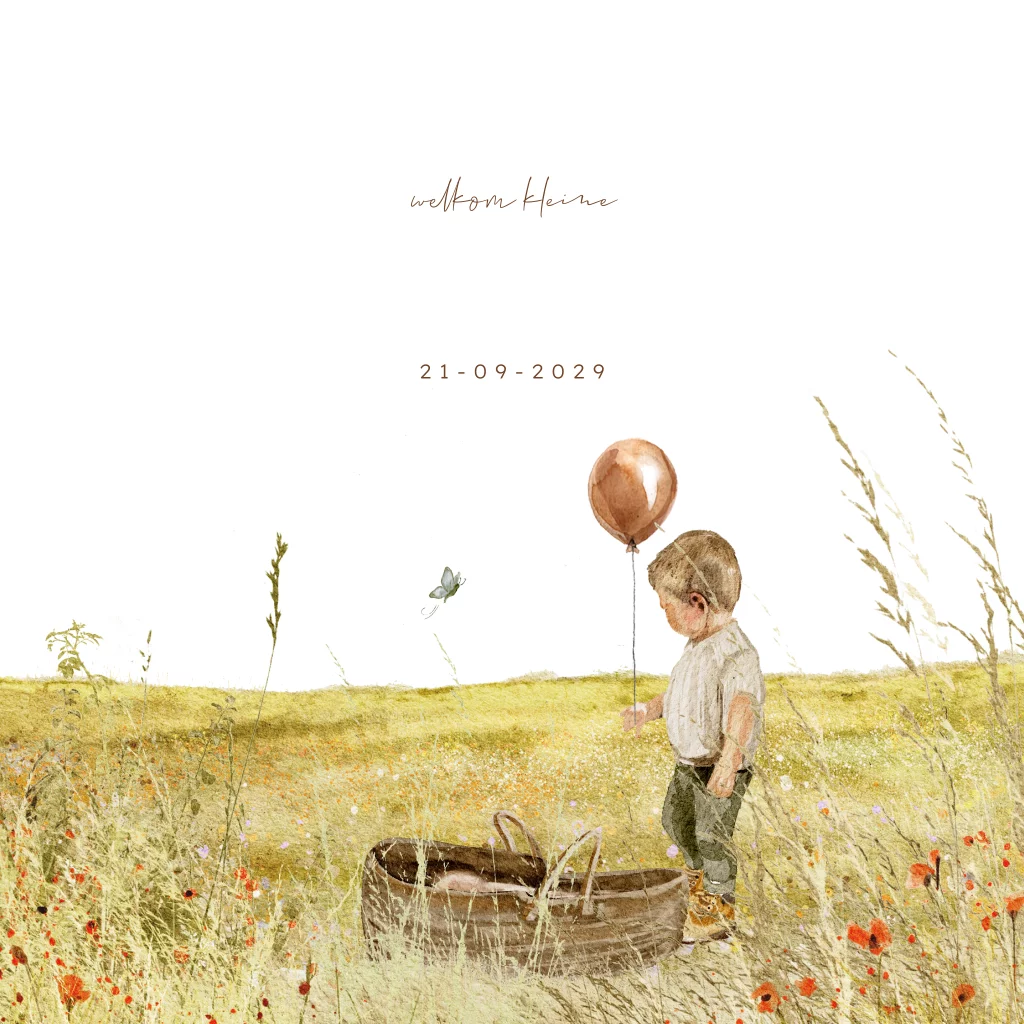 Prachtige geboortekaartje van een klaproze veld en daar achter een broertje bij een mandje met baby. De broer heeft een oranje ballon in zijn handje. Je kunt dit kaartje helemaal zelf bewerken en aanpassen met andere kindjes of andere ballonkleuren.