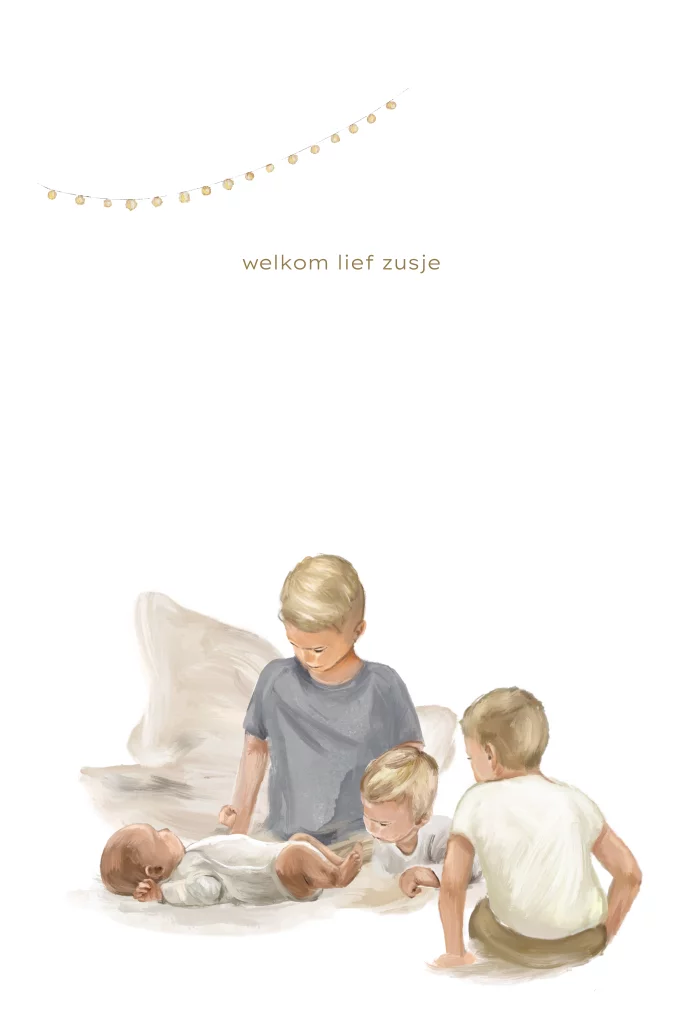 Wat een lief geboortekaartje voor een vierde kindje. De illustratie is in olieverf stijl en je ziet drie oudere broertjes bij een baby. De tekening is geschilderd en heeft een hele lieve uitstraling. We kunnen ook andere gezinssamenstellingen maken, vraag gerust even hulp. De naam wordt gedrukt in rosé folie, maar je kan deze ook aanpassen in een ander soort folie.