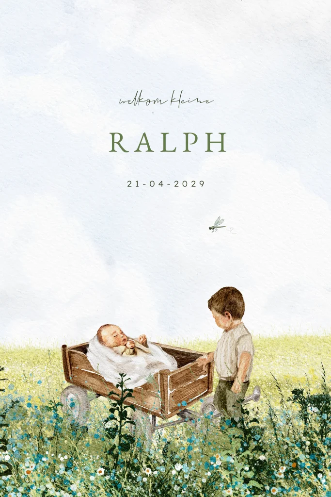 Uniek geschilderd geboortekaartje met een broer bij een broertje in een bolderkar. De aquarel illustraties van de wolkenlucht en de veldbloemen zijn prachtig. Door de frisse groene kleuren is dit kaartje leuk voor een jongen die in de zomer geboren wordt. De kindjes zijn makkelijk te vervangen als je bijvoorbeeld een eerste kindje krijgt.