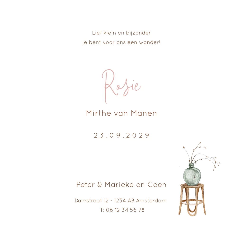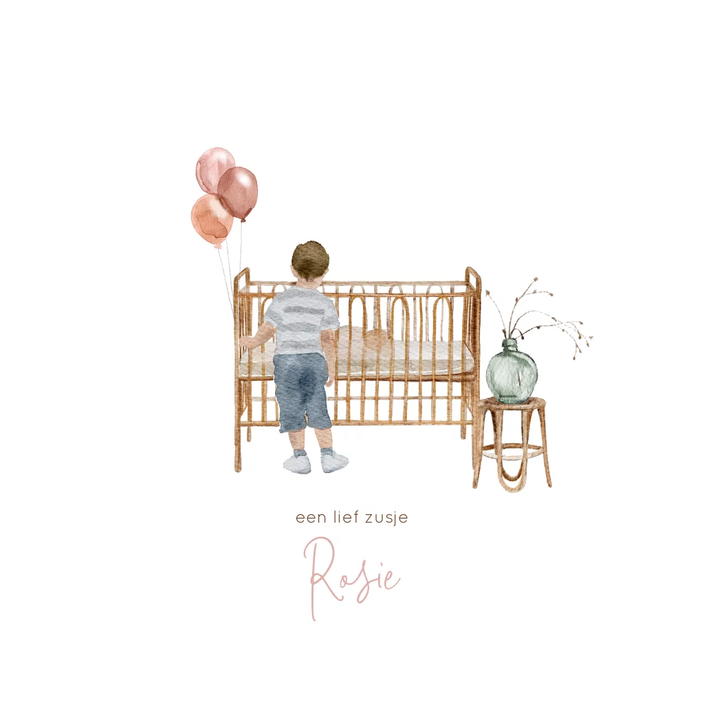 Super lief getekend geboorte kaartje voor een zusje.Bij het ledikant staat een grotere broer met roze ballonnen in zijn hand. Je kunt dit kaartje voor een tweede kind helemaal zelf bewerken en aanpassen.