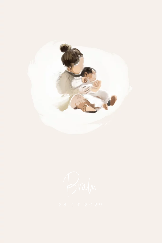 Lief getekend geboortekaartje voor een broertje in een mooie aquarel stijl. De oudere zus met een knotje houdt de baby vast. Leuk voor een jongen, maar ook te gebruiken als jullie tweede kind een meisje is. De zwarte folie maakt het extra stoer.