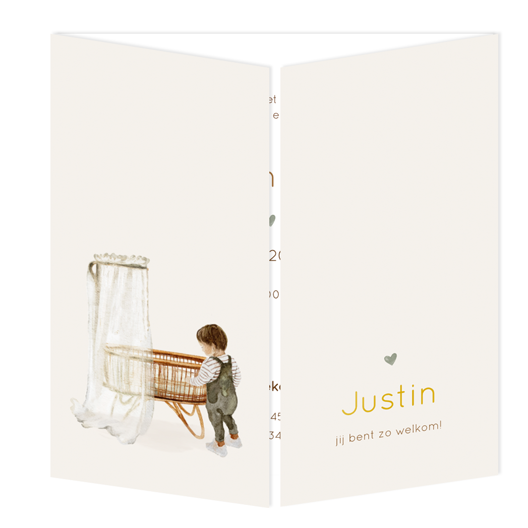 Een schattig getekend geboortekaartje voor een broertje. Dit kaartje is een tweeluik, ook wel theatervouw genoemd, en heeft aan de voorkant twee luikjes die je kunt openen. Op het ene luikje staat een illustratie van een broertje bij de wieg, en op het andere luikje de naam van jullie kindje in goudfolie. Je kunt dit kaartje zelf personaliseren in onze handige editor. Vervang het jongetje eenvoudig door andere kindjes.