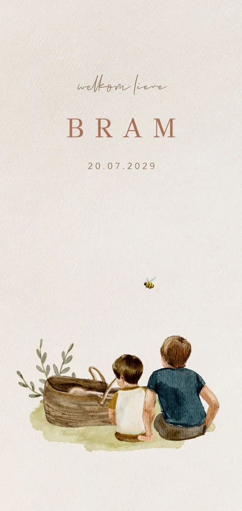 Wat een lief getekend geboortekaartje is dit voor jullie derde kindje. Het kaartje is getekend in een aquarel- en watercolour stijl en bevat een afbeelding van een baby in een mandje, met twee broertjes erbij. De achtergrond heeft een aquarel papier look. Je kunt dit kaartje zelf bewerken en aanpassen naar je eigen gezin.