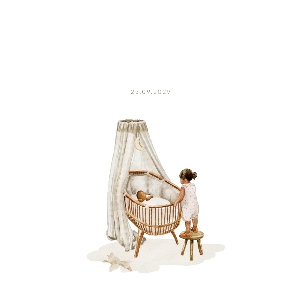 Lief getekend geboortekaartje voor getinte kindjes. In de wieg ligt een baby met een donkere huidskleur en op het krukje naast de wieg staat een ouder zusje over de rand van de wieg te kijken. De naam wordt gedrukt in goudfolie maar kan ook met een andere kleur. Je kunt de zus ook vervangen door een broertje of andere kindjes uit onze beeldbank. Heb je hulp nodig laat even weten.