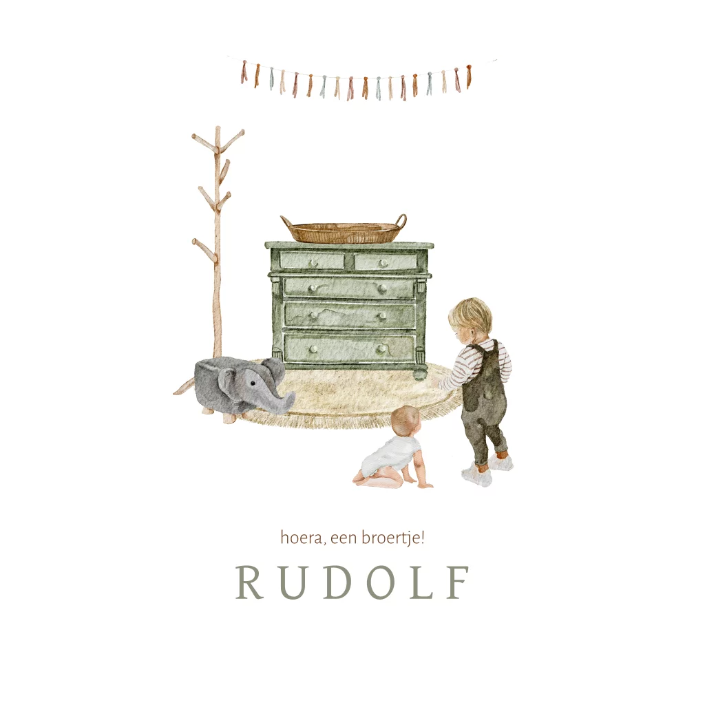 Getekend geboortekaartje met een peuter jongetje en een baby broertje op de grond. Ze staan getekend in een kinderkamer setting. Ook te gebruiken als jullie tweede kind een meisje is. Alle illustraties staan los op het kaartje en kan je zelf naar wens aanpassen.