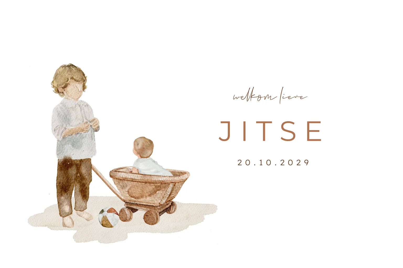 Lief getekend geboortekaartje met een illustratie van een grote broer bij een baby broertje in een kar. Bij de kar ligt nog een speelgoed bal. Schattige geboortekaartje voor een tweede kind.