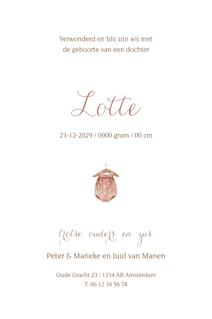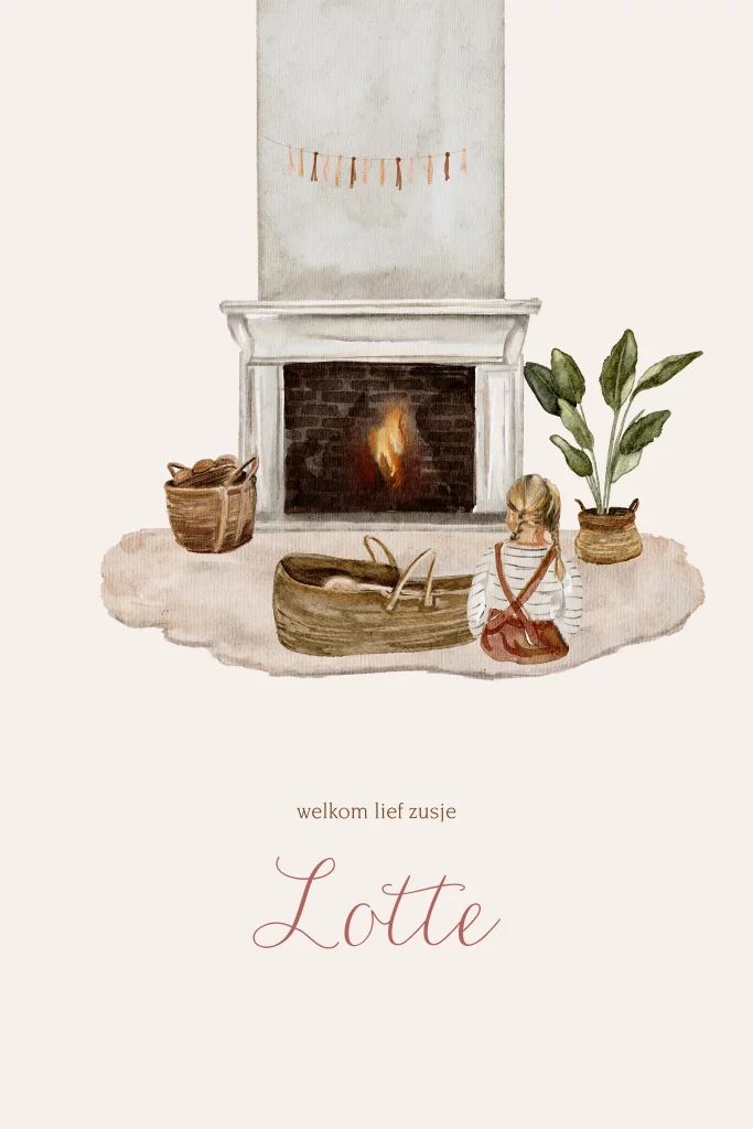 Lief getekend geboortekaartje voor een winter kindje. Op het kaartje staat een open haard en een vloerkleed met daarbij een baby in een mandje met een oudere zus ernaast. Aan de open haard hangt een oudroze vlaggenlijn.
