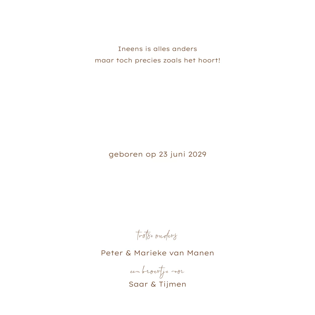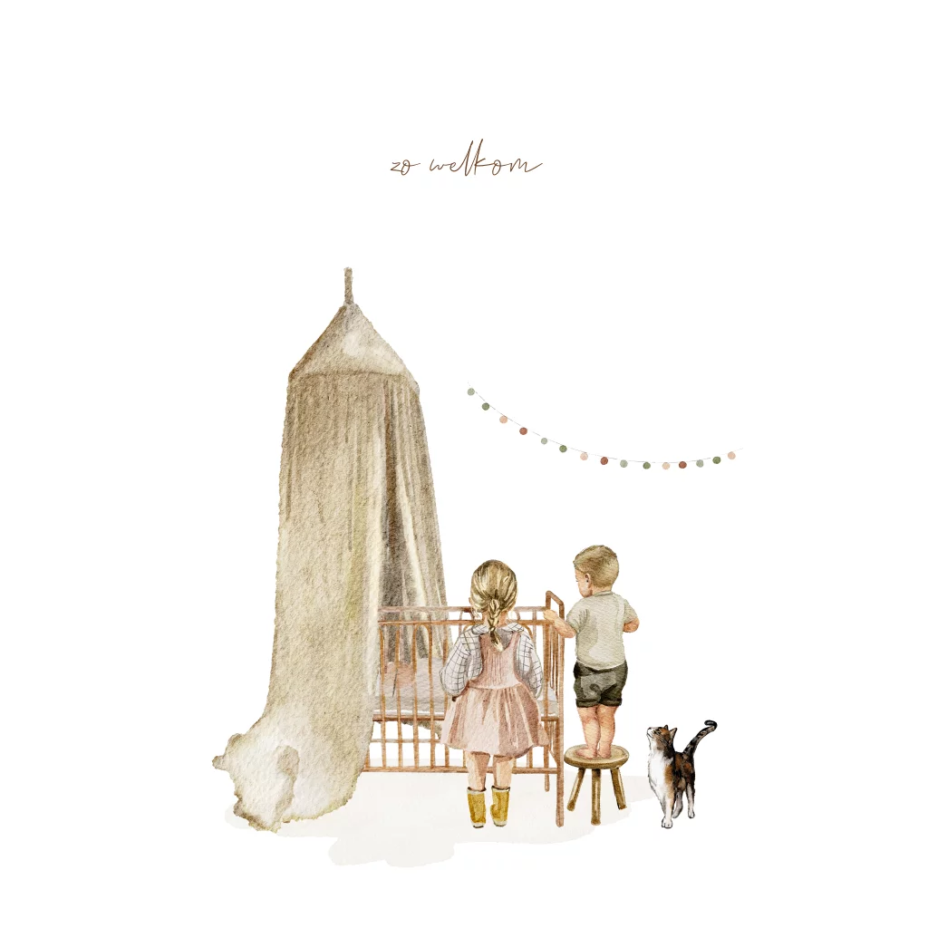 Een lief getekend geboortekaartje voor een jongen of een meisje. Bij een wieg staan een oudere zus en een broertje op een krukje. Daarbij loopt nog een kat. Dit unisex geboortekaartje voor een derde kindje kan je zelf helemaal bewerken. De kindjes en de kat kan je zelf aanpassen of verwijderen. In onze beeldbank vind je nog veel meer tekeningen van kinderen en huisdieren. Zo maak je zelf een uniek geboortekaartje. De naam wordt gedrukt in goudfolie.