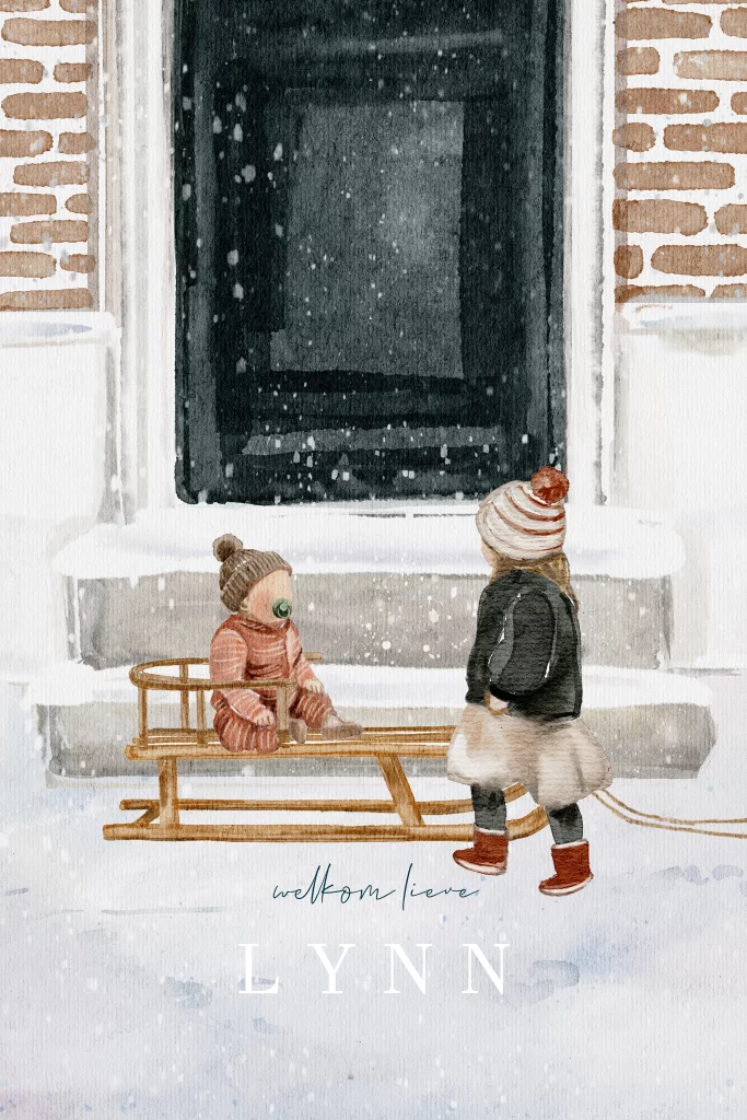 Uniek getekend geboortekaartje voor een zusje. Dit winter kaartje voor een meisje heeft een prachtige achtergrond illustratie van een voordeur in de sneeuw. Op een slee zit een baby en daarbij staat een oudere zus. De ronde hoeken en foliedruk maken dit winterse babykaartje helemaal af.
