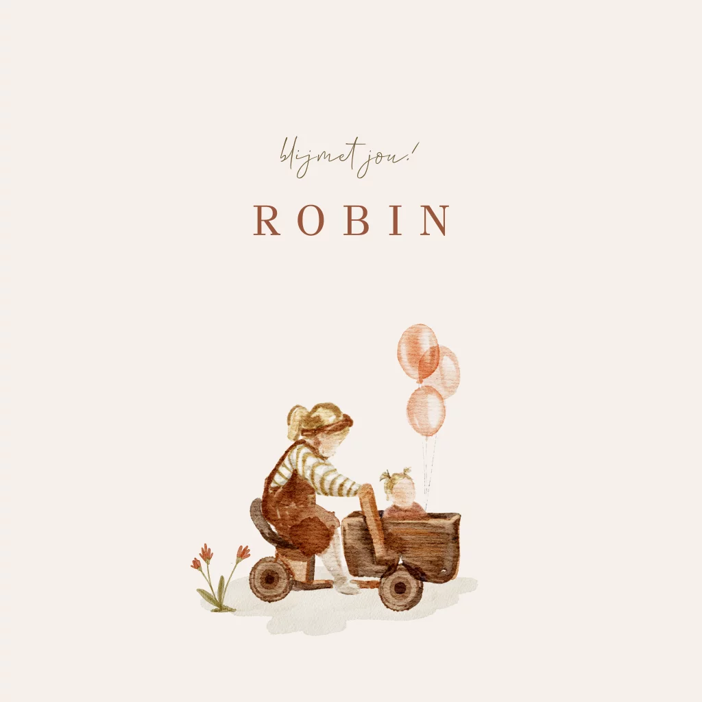 Getekend geboortekaartje zusje met grote zus op fiets met baby