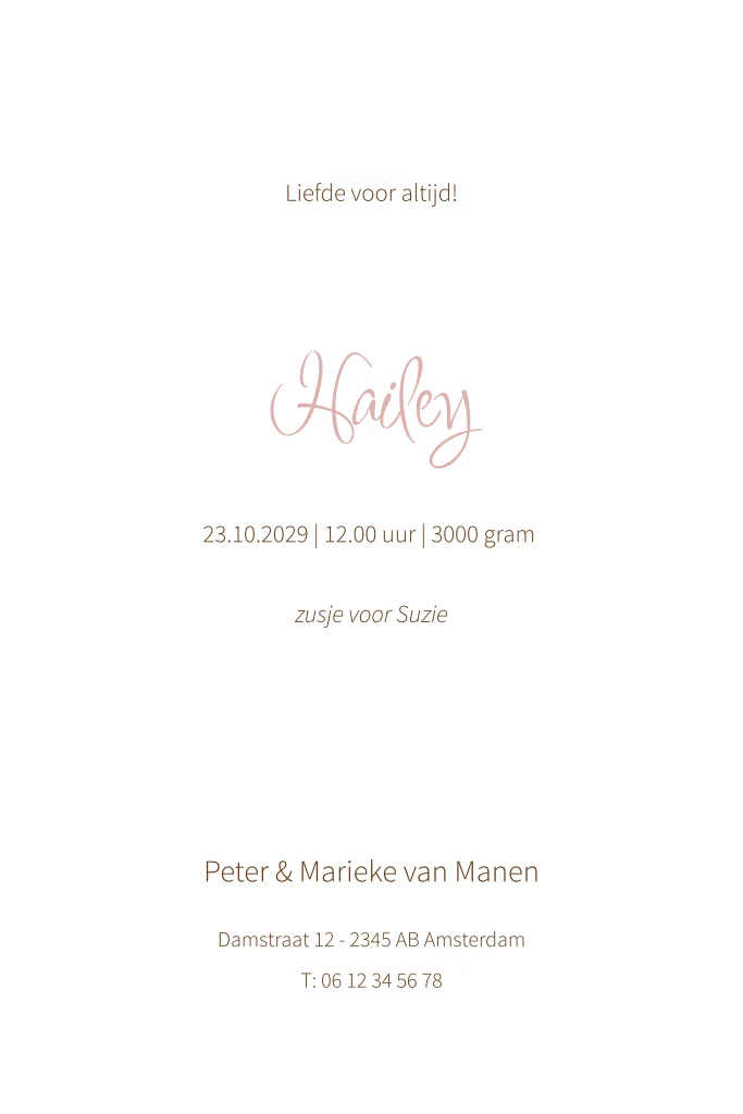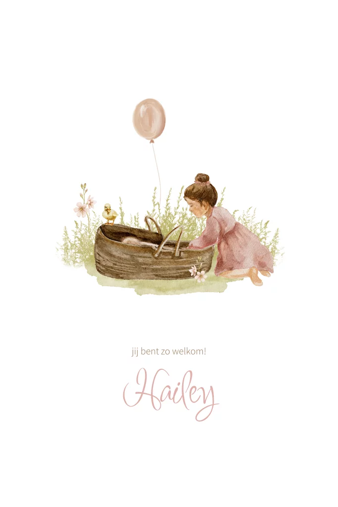 Geboortekaartje voor een tweede kindje dat in de lente wordt geboren. Bij een mandje met een baby zit een grote zus die in de mand kijkt. Dit kaartje is voor een meisje met de roze ballon, maar als je deze vervangt door een andere kleur ballon, wordt het een kaartje voor een jongen. Kom je er niet uit? We helpen je graag mee.